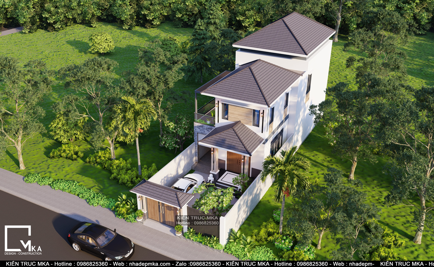 Với diện tích khiêm tốn của khu đất là rộng 6.7m và dài 25m .Kiến Trúc MKA đã đưa ra phương án Thiết kế kiến trúc mái kiểu nhật hiện đại . Mẫu nhà mái nhật khá đơn giản, Thiết kế tông màu chủ đạo là màu trắng kết hợp với các mảng kính,tạo nên cảm giác thoải mái và dễ chịu cho gia chủ.