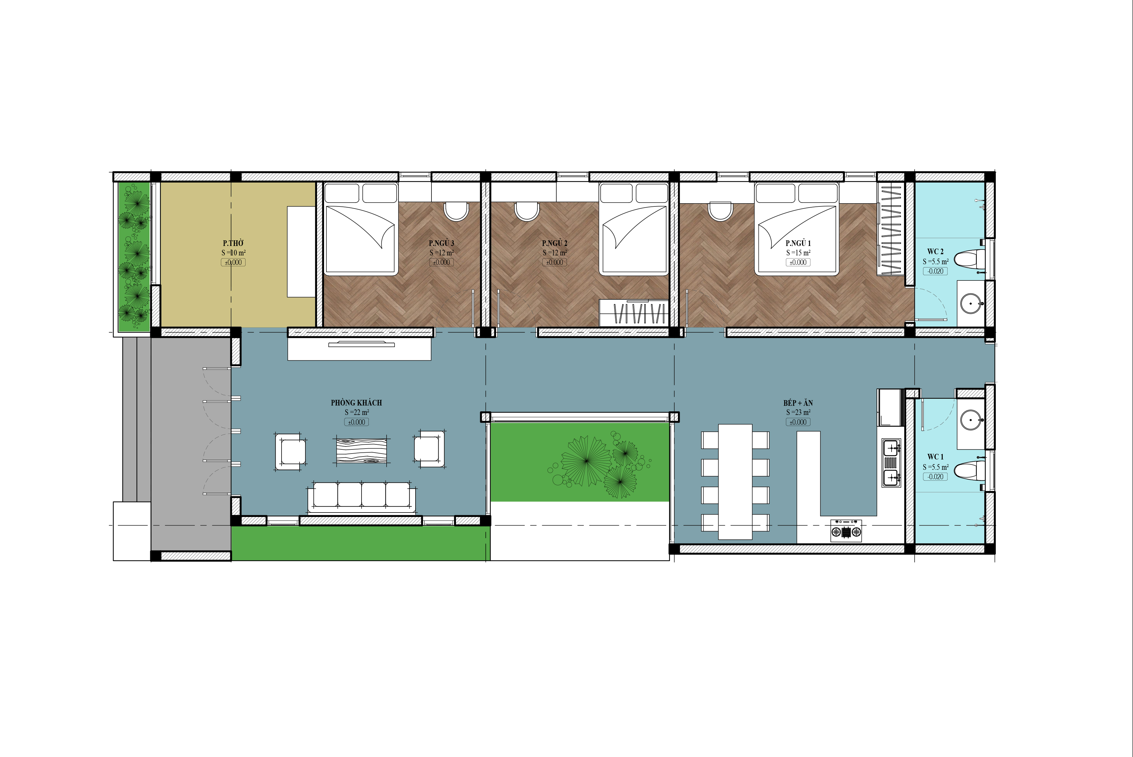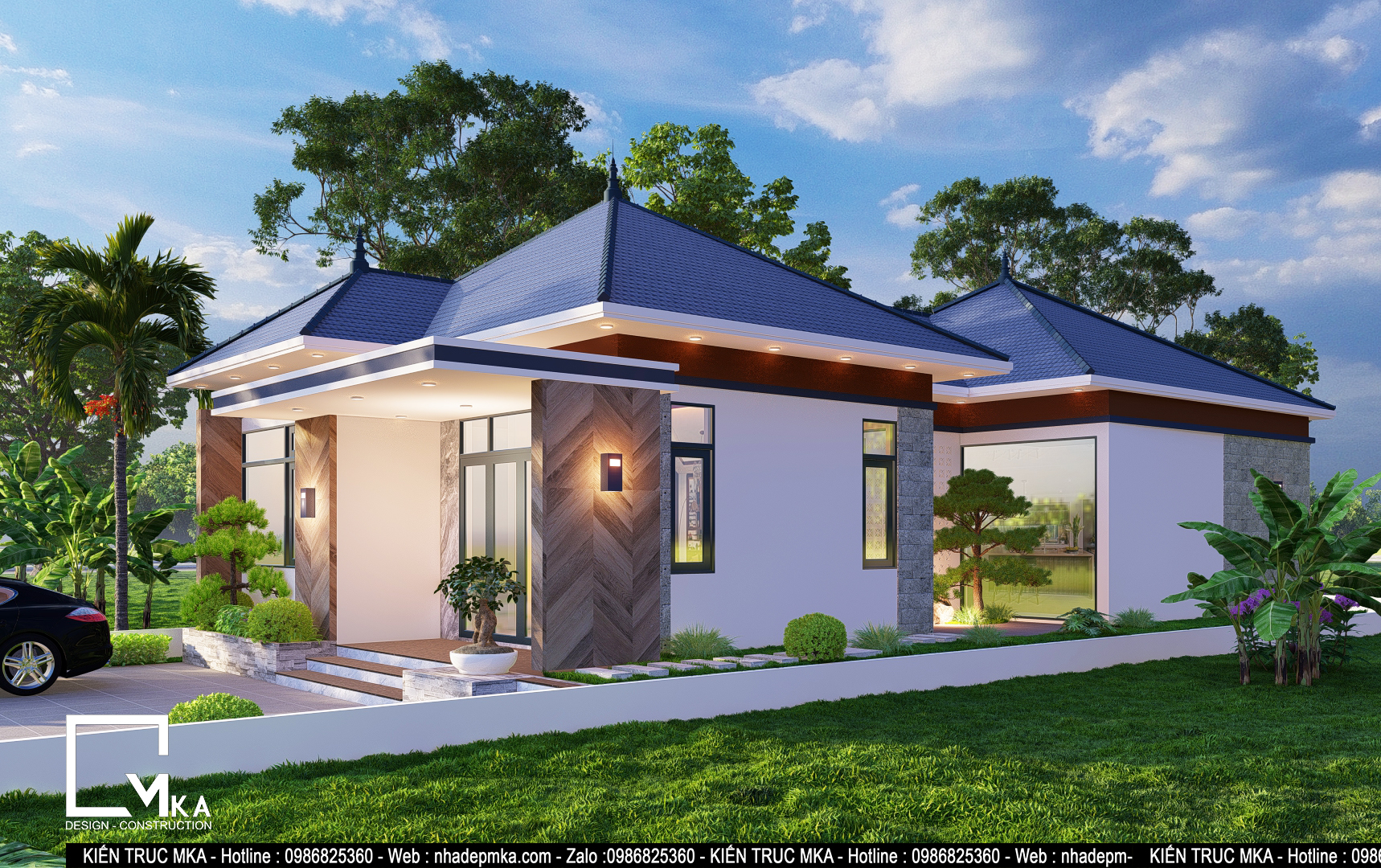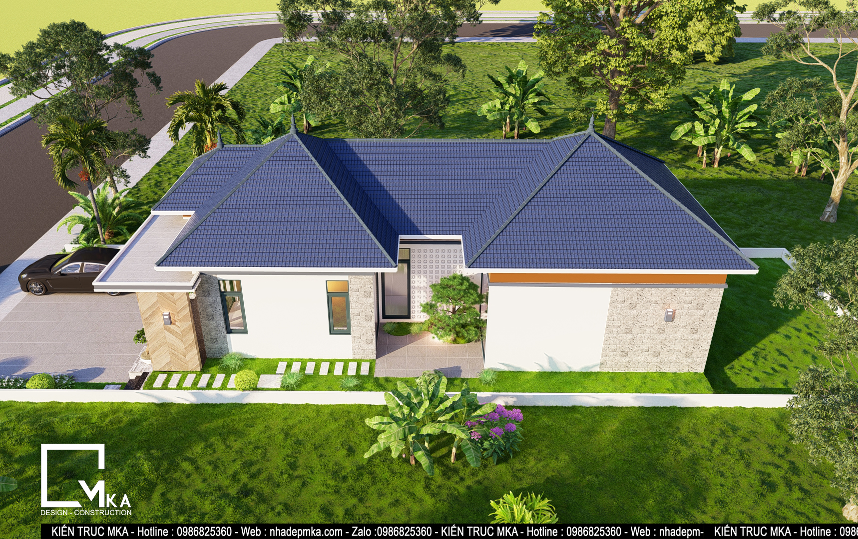 Trong mẫu biệt thự nhà vườn 1 tầng ở Đồng Nai này, KTS MKA đã dành phần lớn diện tích cho phần sân trước và sân sau. Thiết kế không chú ý quá nhiều đến tiểu cảnh trang trí mà thay vào đó là dành diện tích trống cho khoảng sân để tăng sự thông thoáng cũng như có nhiều khoảng trống cho các hoạt động sinh hoạt, giải trí ngoài trời.