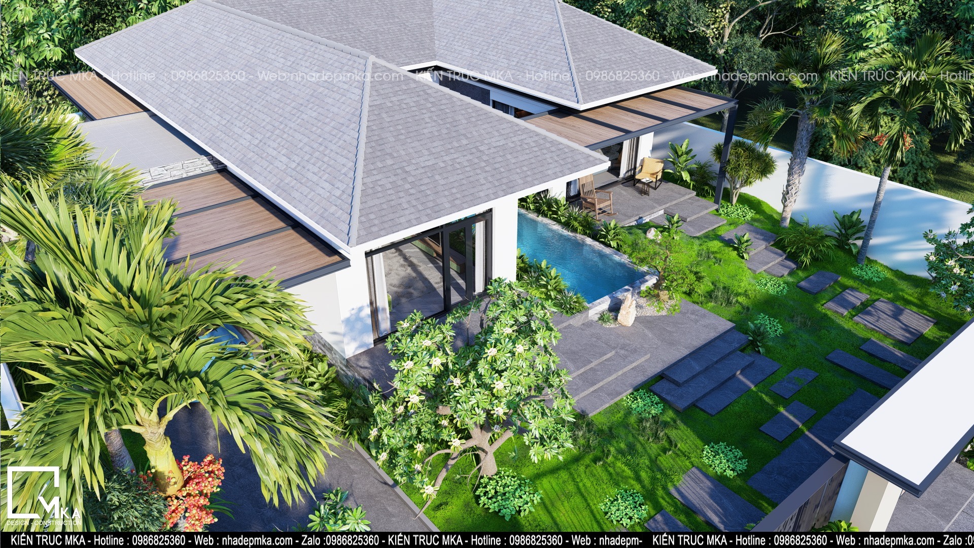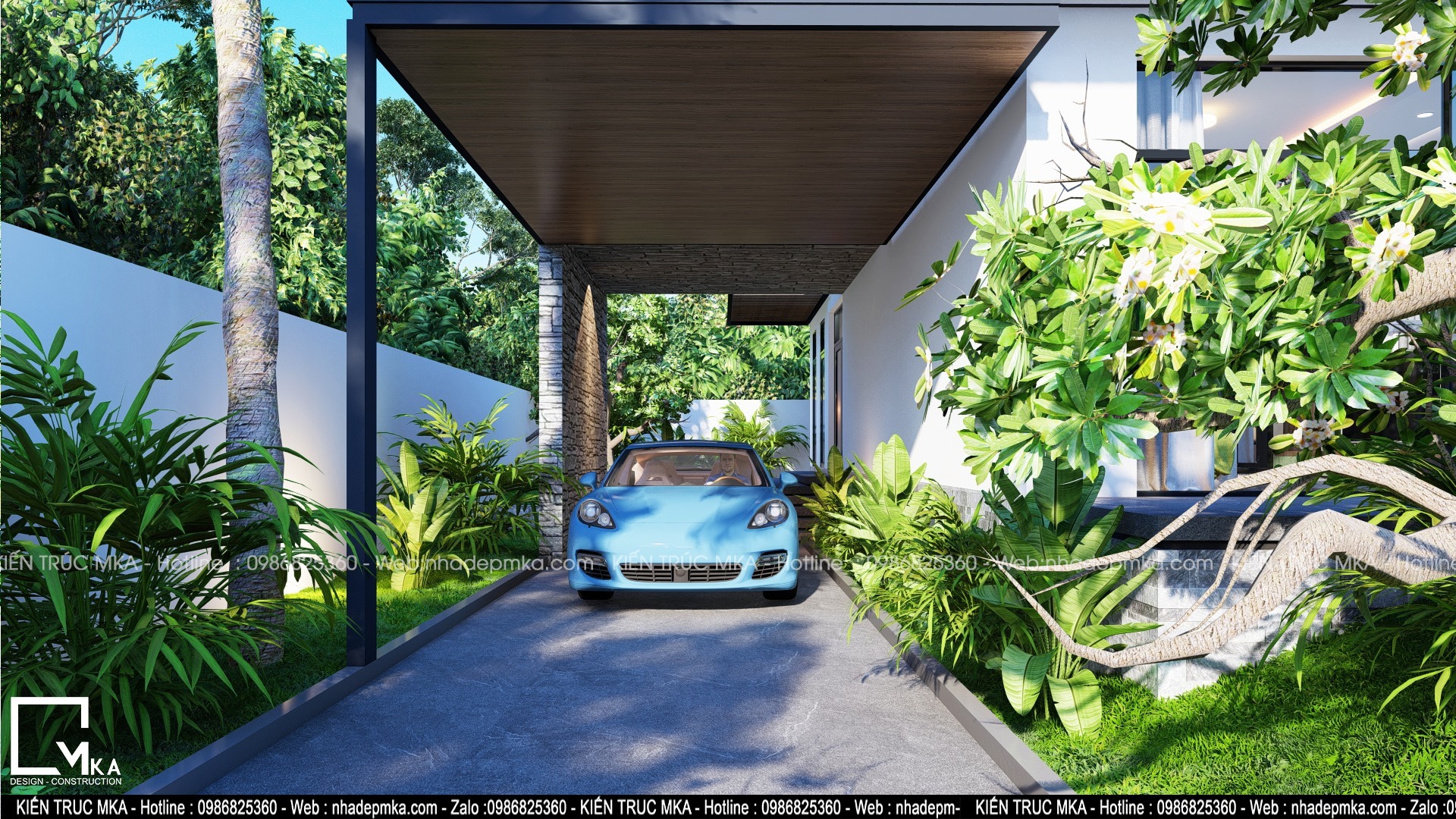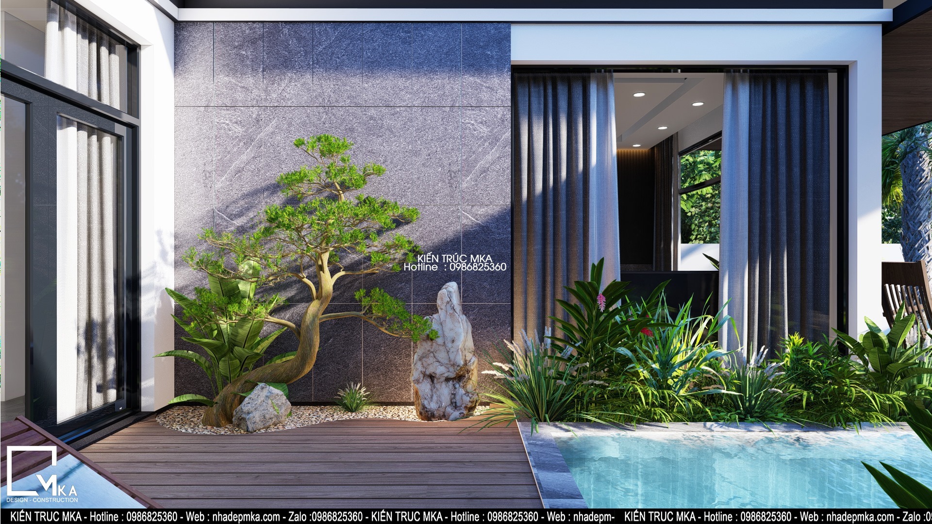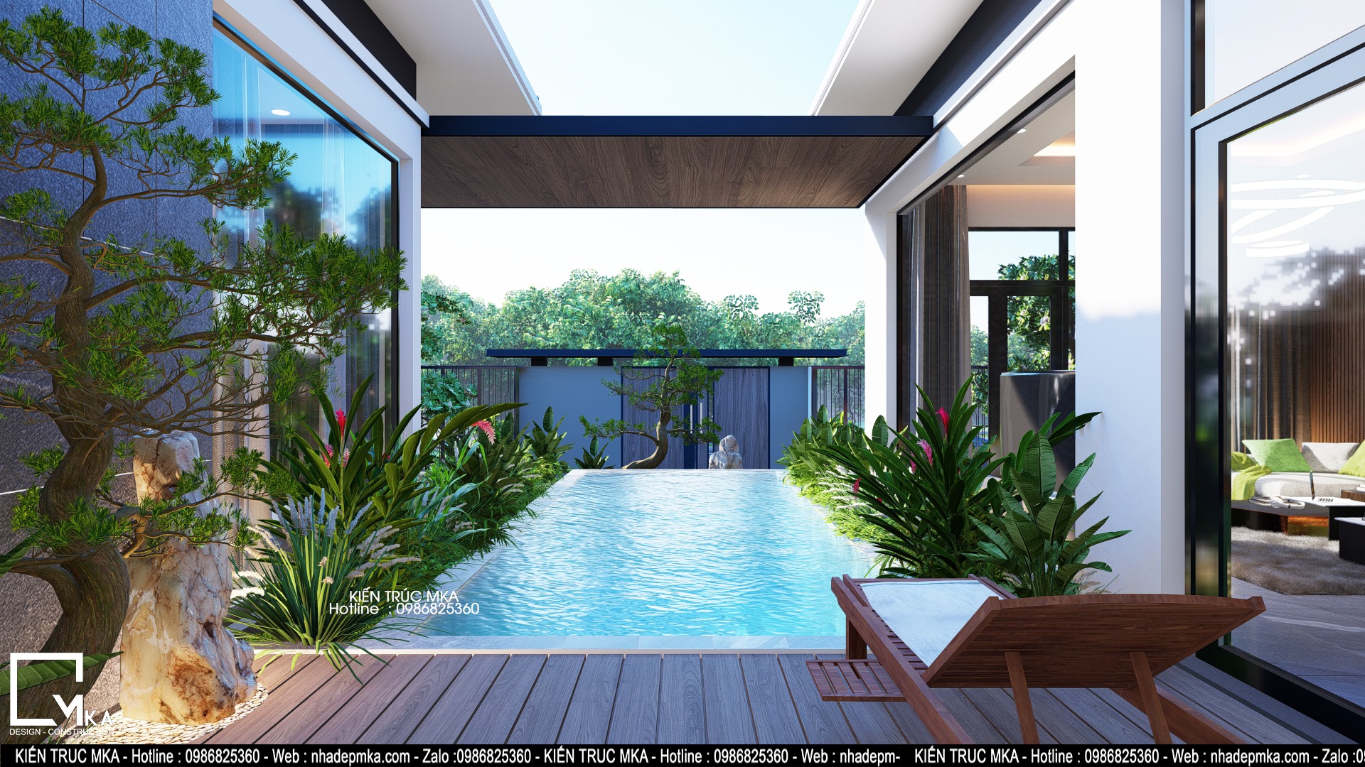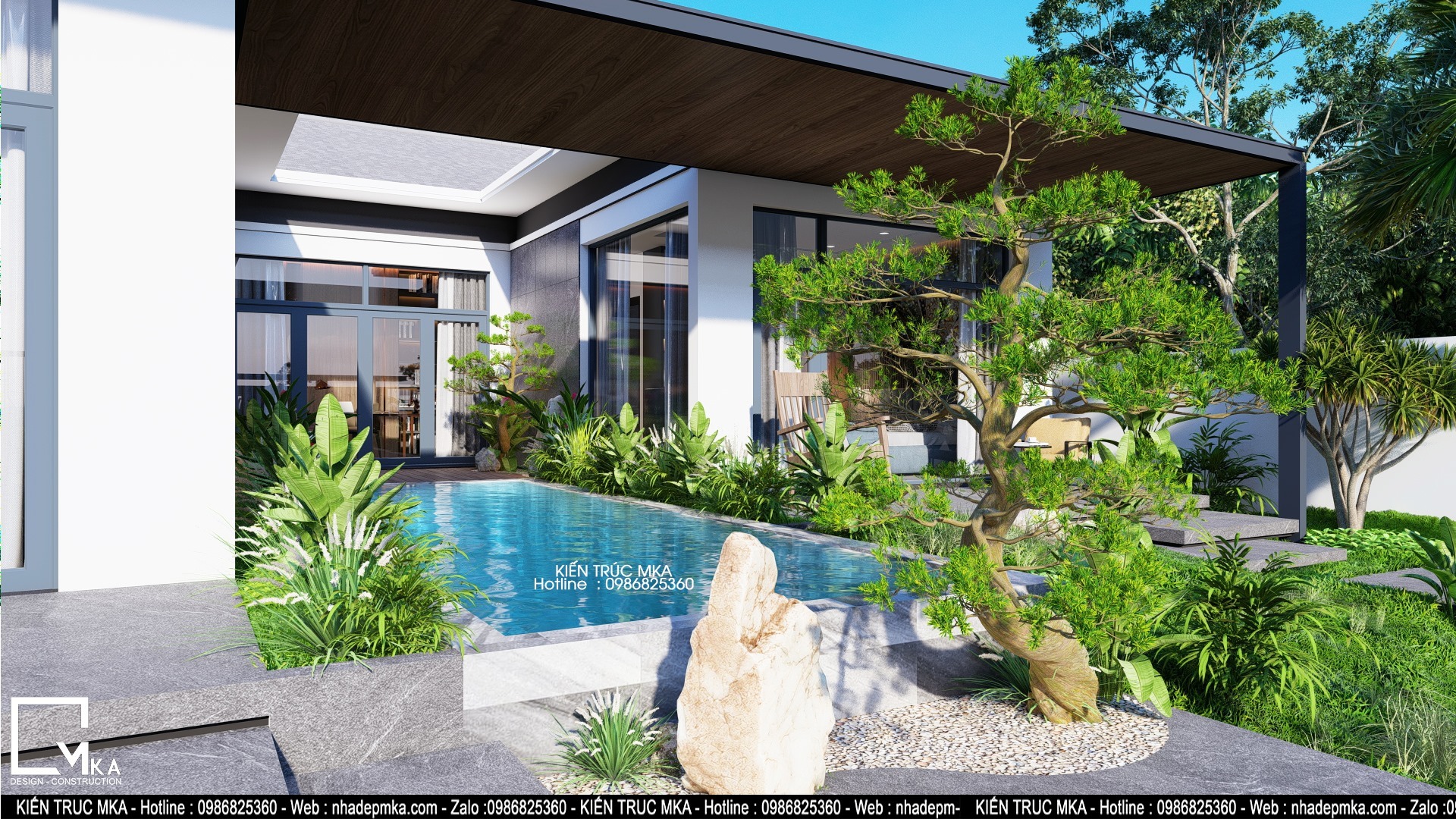 Hồ bơi dk thiết kế nhỏ gọn nằm ở trung tâm căn nhà. Là điểm nhấn chính của căn nhà củng là nơi điều hòa không khí cho căn nhà. Hai bên hồ bơi đội ngủ thiết kế của MKA đã đưa cây xanh vào kết hợp với mặt nước tạo nên view nhìn đẹp cho không gian phòng khách và phòng phòng ngủ mater.