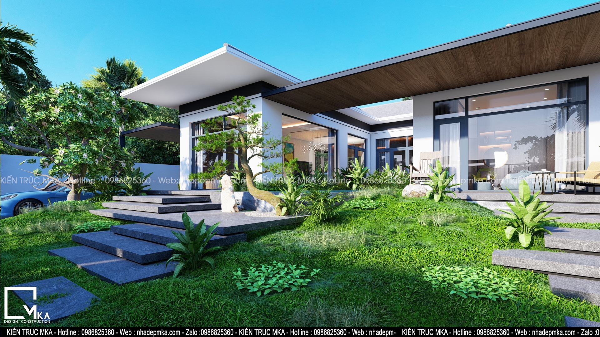 Lối đi bằng đá xen lẩn ssan vườn tạo nên sự khác biệt của căn biệt thự. Sân vườn được tạo bởi các đồi cỏ cao thấp khác nhau. Mặt tiền chính của căn nhà là nhửng mảng tường trắng kết hợp các cửa kính trong sốt làm cho mặt tiền căn nhà trở nên sang trọng và thoáng mát