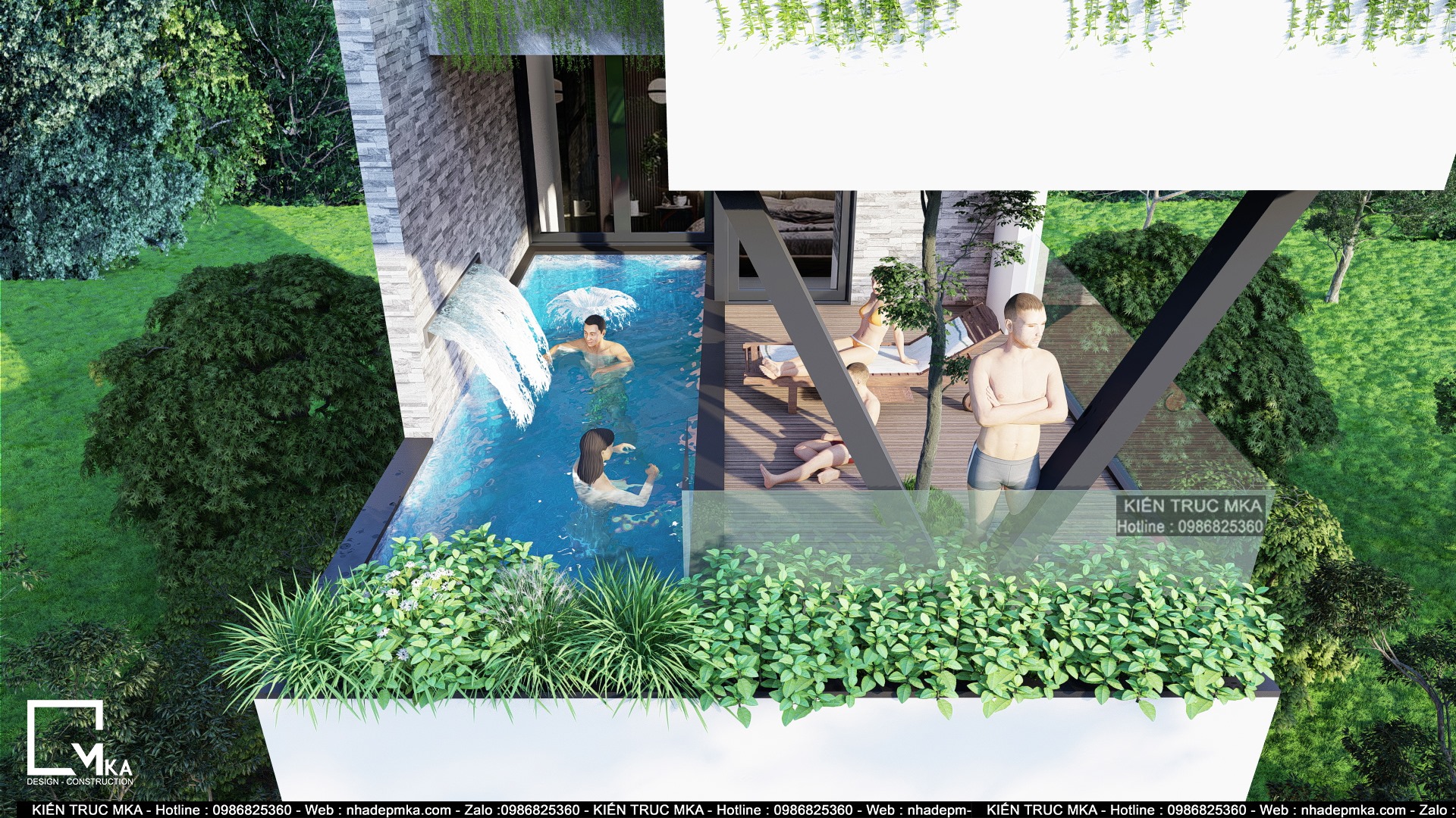 Hồ bơi vô cực trên mái là không gian thư giản cho cae gia đình vào dịp cuối tuần . Không gian trồng cây thông từ lầu 2 lên lầu 3 kết hợp với hồ bơi là điểm nhấn của căn nhà.Ban công các tầng được trồng cây xanh tạo vùa chắn nắng đón gió cho không gian bên trong .