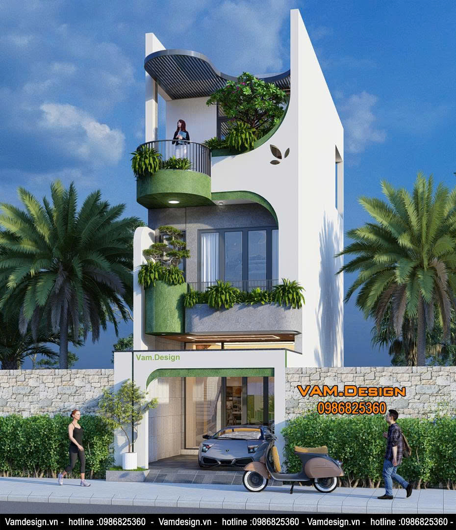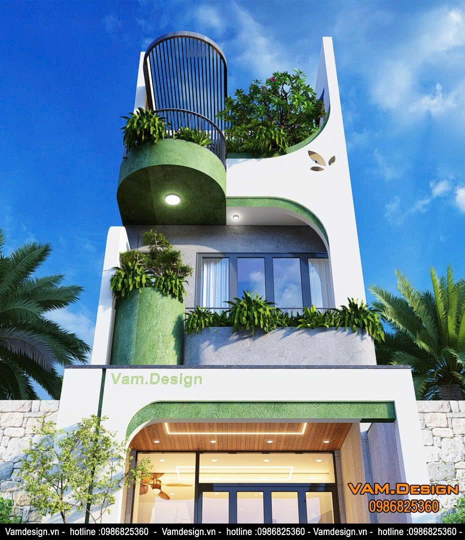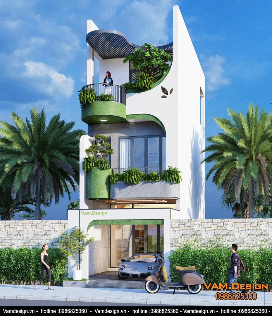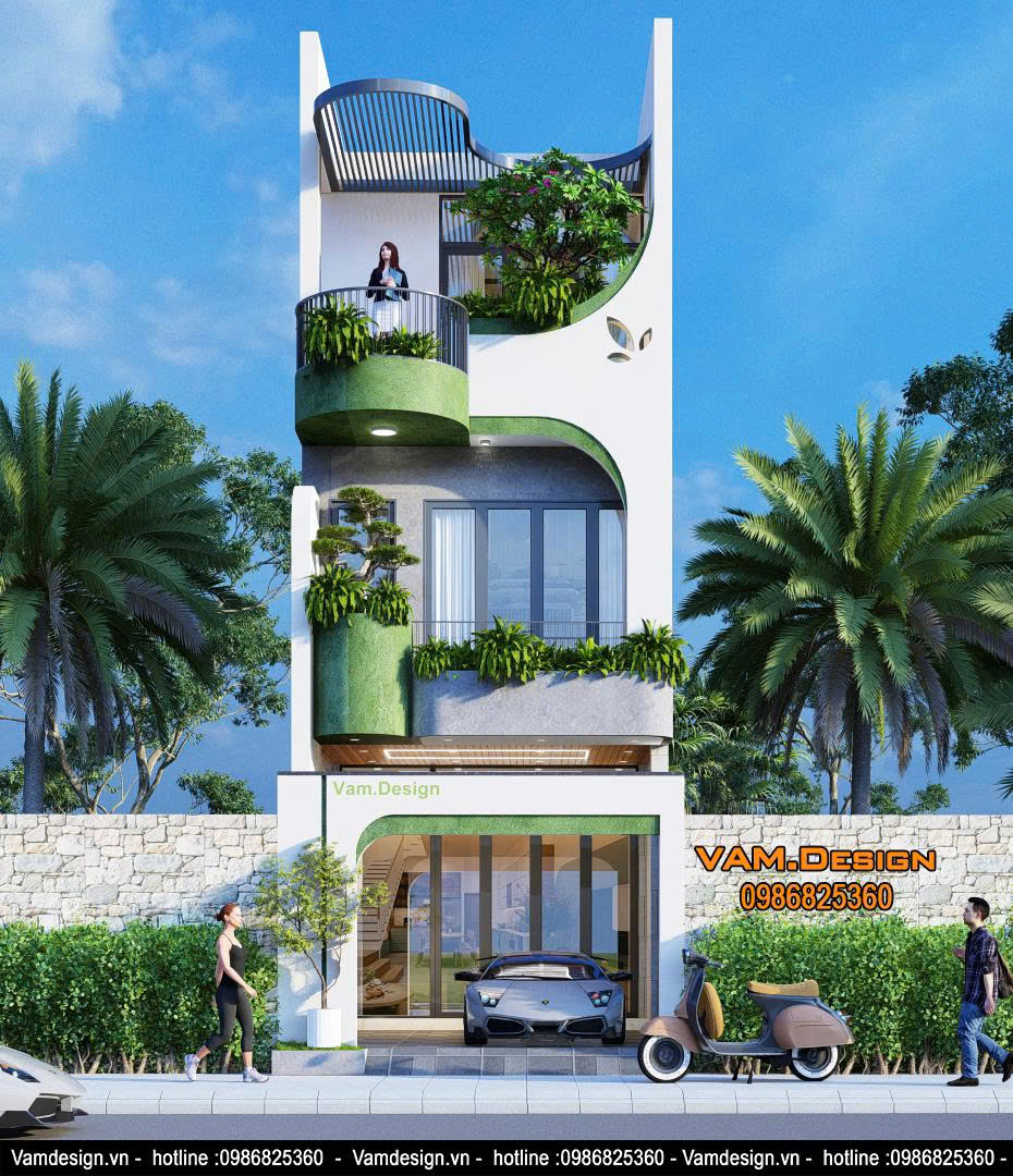 Điểm nhấn nổi bật nhất là hệ thống tiểu cảnh xanh được bố trí ở ban công và các bồn cây trên tầng. Tầng 2, 3 và trên cùng được phủ một màu xanh của cây cối, tạo nên một không gian sống xanh mát, trong lành ngay giữa lòng đô thị. Đặc biệt, ban công ở tầng 2 được thiết kế dạng tròn, ốp vật liệu màu xanh rêu, như một "ốc đảo" nhỏ treo lơ lửng, vô cùng ấn tượng. Tầng trên cùng là một sân thượng thoáng đãng với mái vòm lam che nắng, nơi lý tưởng để thư giãn và ngắm cảnh.