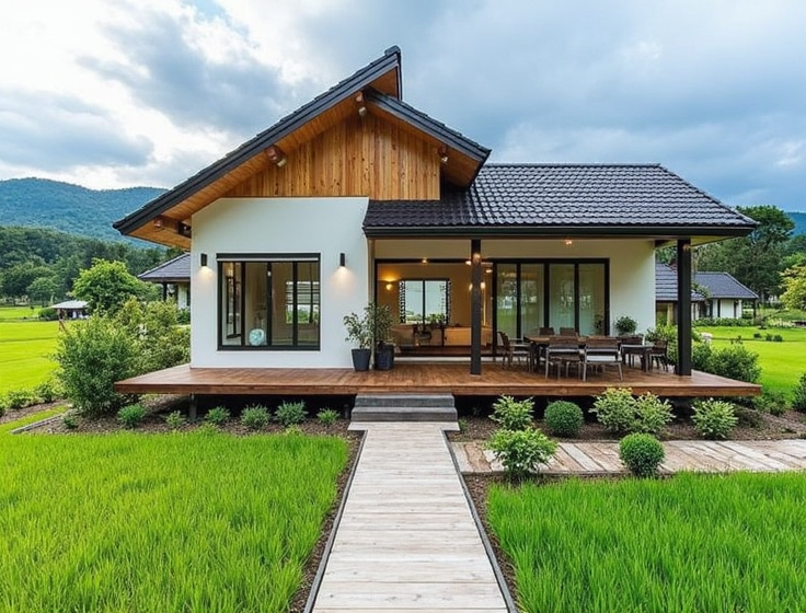Ngôi nhà được đặt trên một nền cao, bao quanh là sàn gỗ mộc mạc, tạo cảm giác sạch sẽ, sang trọng và tách biệt khỏi mặt đất ẩm. Lối đi bằng gỗ thẳng tắp xuyên qua thảm cỏ xanh là một điểm nhấn tinh tế, dẫn lối vào không gian sống bình yên.