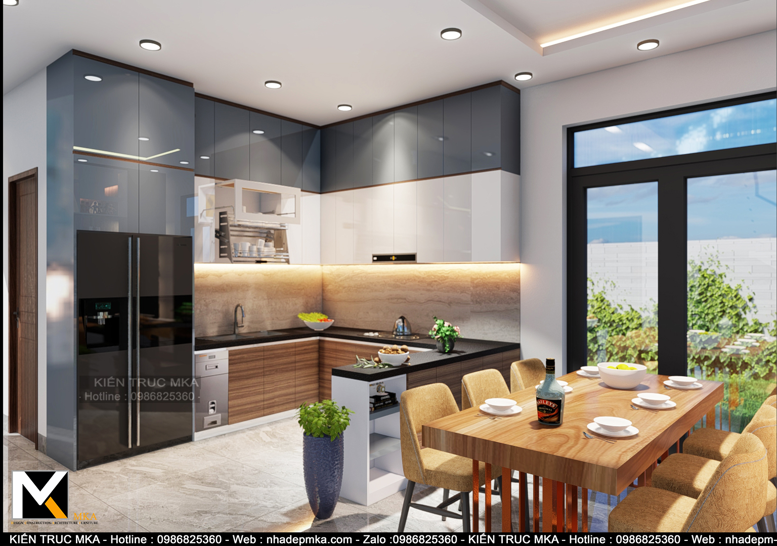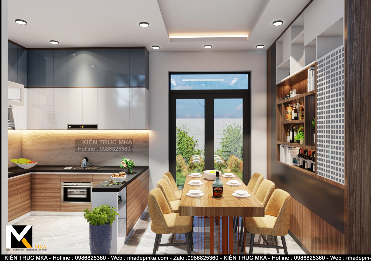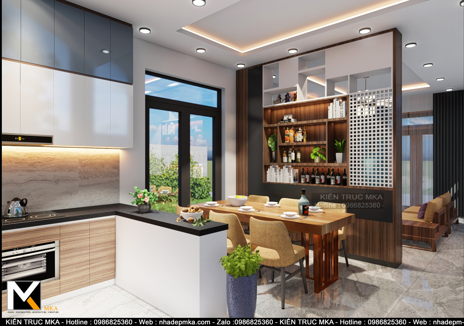 Toàn cảnh nhà bếp với nội thất biệt thự hiện đại làm nổi bật không gian xung quanh