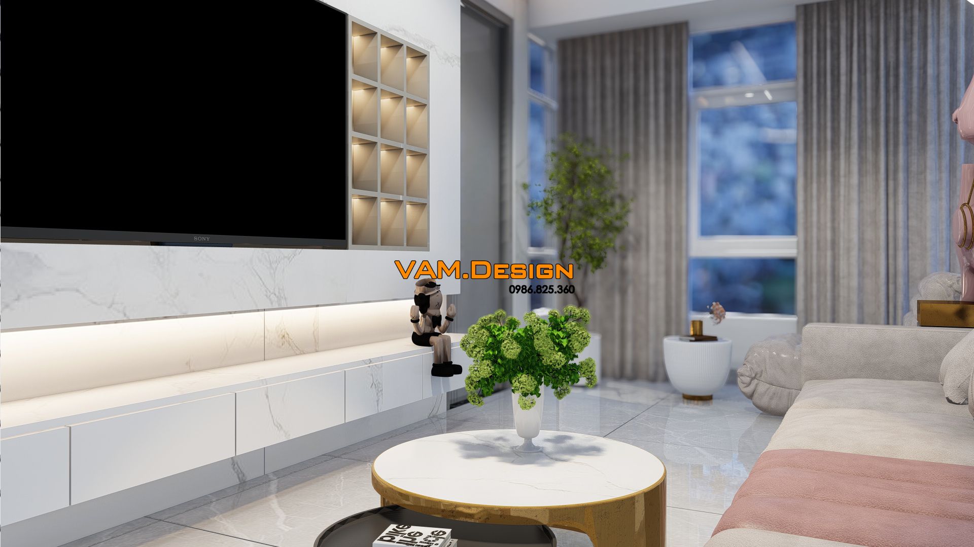 Bàn trà tròn nhỏ gọn với mặt đá cẩm thạch trắng là điểm nhấn tinh tế, hoàn thiện bức tranh tổng thể của một phòng khách sang trọng và ấm cúng. Thiết kế hình tròn giúp không gian mềm mại hơn, tránh cảm giác cứng nhắc của các đồ vật góc cạnh, đồng thời an toàn hơn cho trẻ nhỏ. Một vài cuốn sách hay, một bình hoa tươi tắn hay những vật trang trí nhỏ xinh đặt trên bàn trà sẽ tạo thêm điểm nhấn sinh động, thể hiện gu thẩm mỹ tinh tế của gia chủ.
