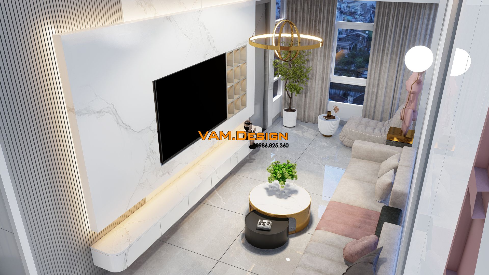 Đặc biệt, chiếc TV được gắn cố định trên bức tường lớn màu trắng là một lựa chọn đầy tính toán. Nó không chỉ giúp tối giản hóa không gian, loại bỏ sự cồng kềnh của kệ TV truyền thống mà còn tạo điểm nhìn liền mạch, giúp căn phòng trở nên gọn gàng và hiện đại hơn.