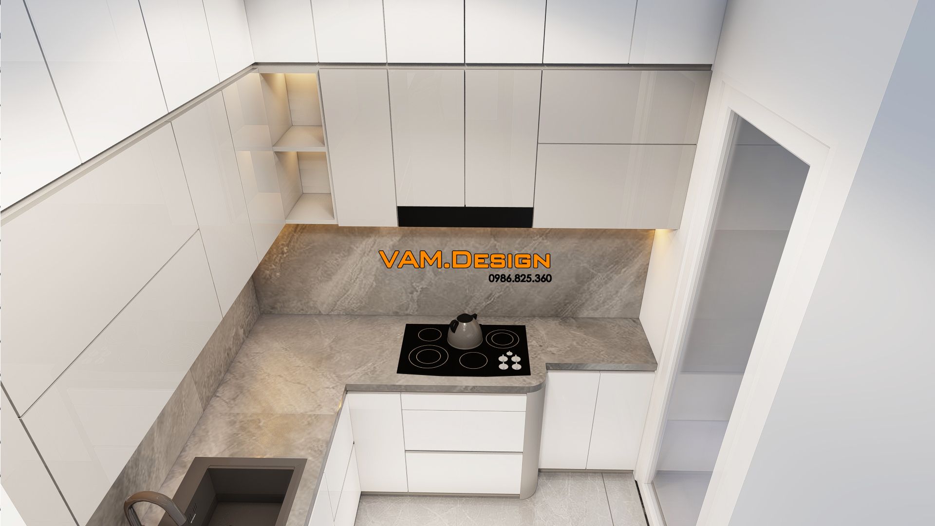 Bề mặt bàn bếp được ốp đá vân xám là điểm nhấn đắt giá, tăng thêm vẻ đẹp sang trọng và đẳng cấp cho tổng thể. Vân đá tự nhiên với những đường nét độc đáo không chỉ là chi tiết trang trí mà còn mang lại tính ứng dụng cao