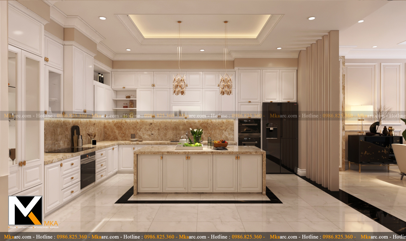 Tủ bếp của căn nhà phố liền kề này là tủ bếp thiết kế ngang với tông màu chính là trắng sứ và phần kính ốp trên tường bếp là màu đen để tạo điểm nhấn khác biệt. Ở dưới khe tủ chạn có lắp 1 dải đèn LED âm để mang lại nhiều ánh sáng trong quá trình nấu nướng. Hệ tủ bao gồm nhiều ngăn chứa nhỏ sẽ giúp các bà nội trợ dễ dàng cất giữ, bảo quản và sắp xếp đồ gia dụng sao cho thật gọn gàng.