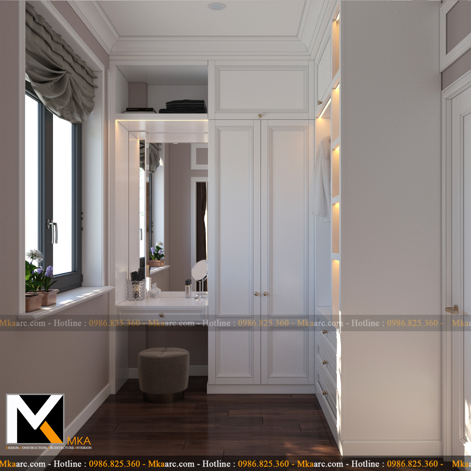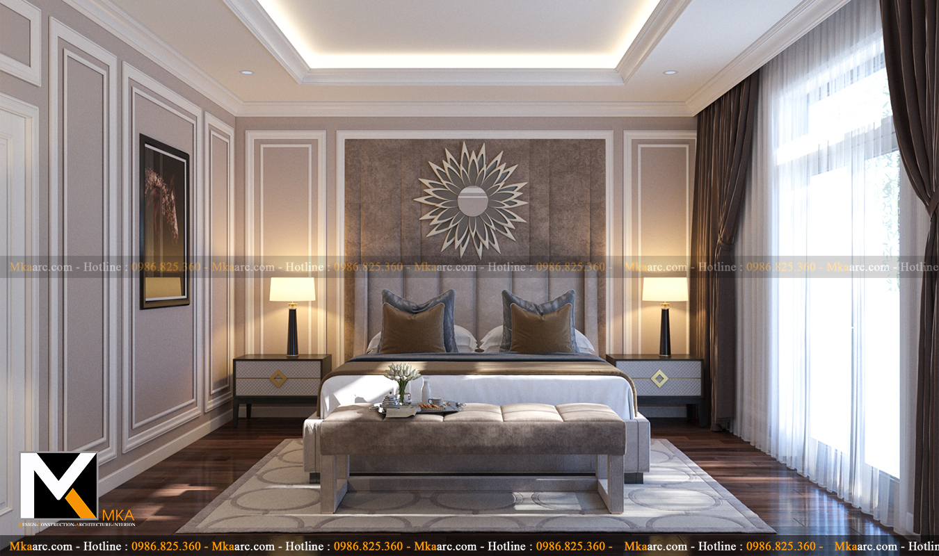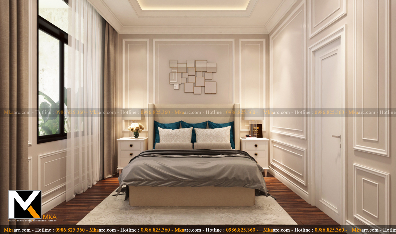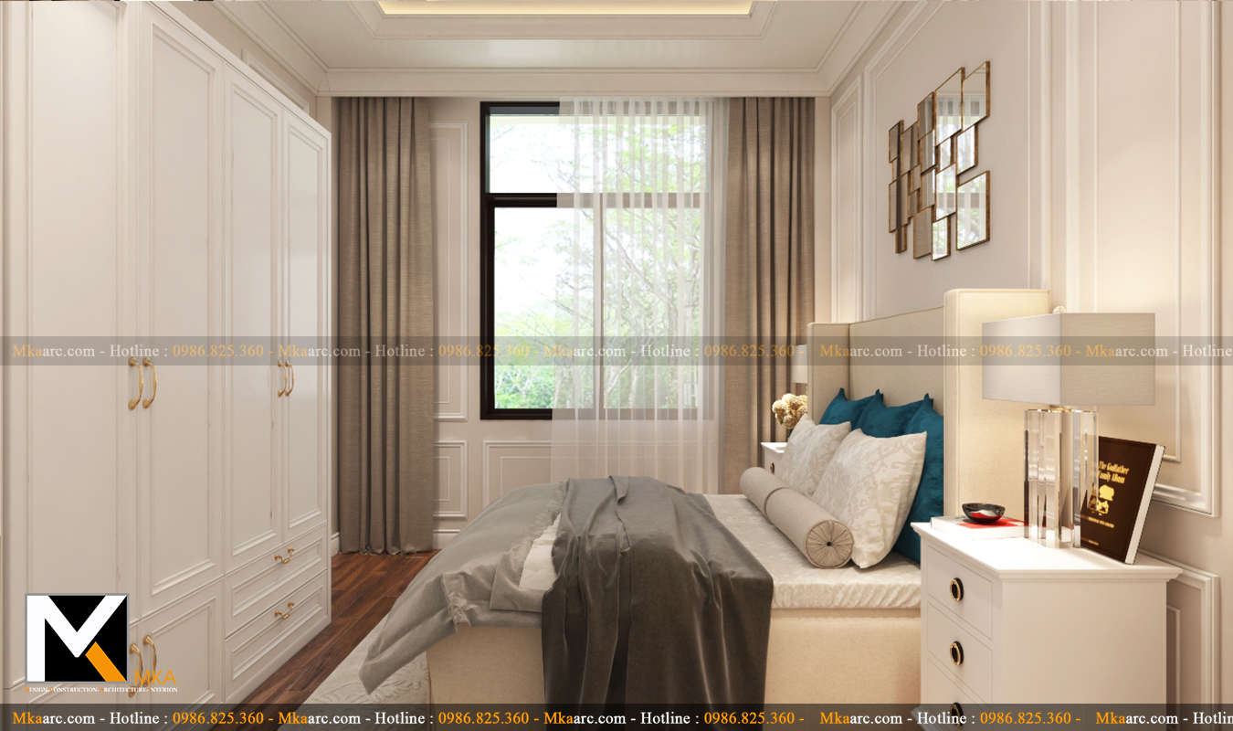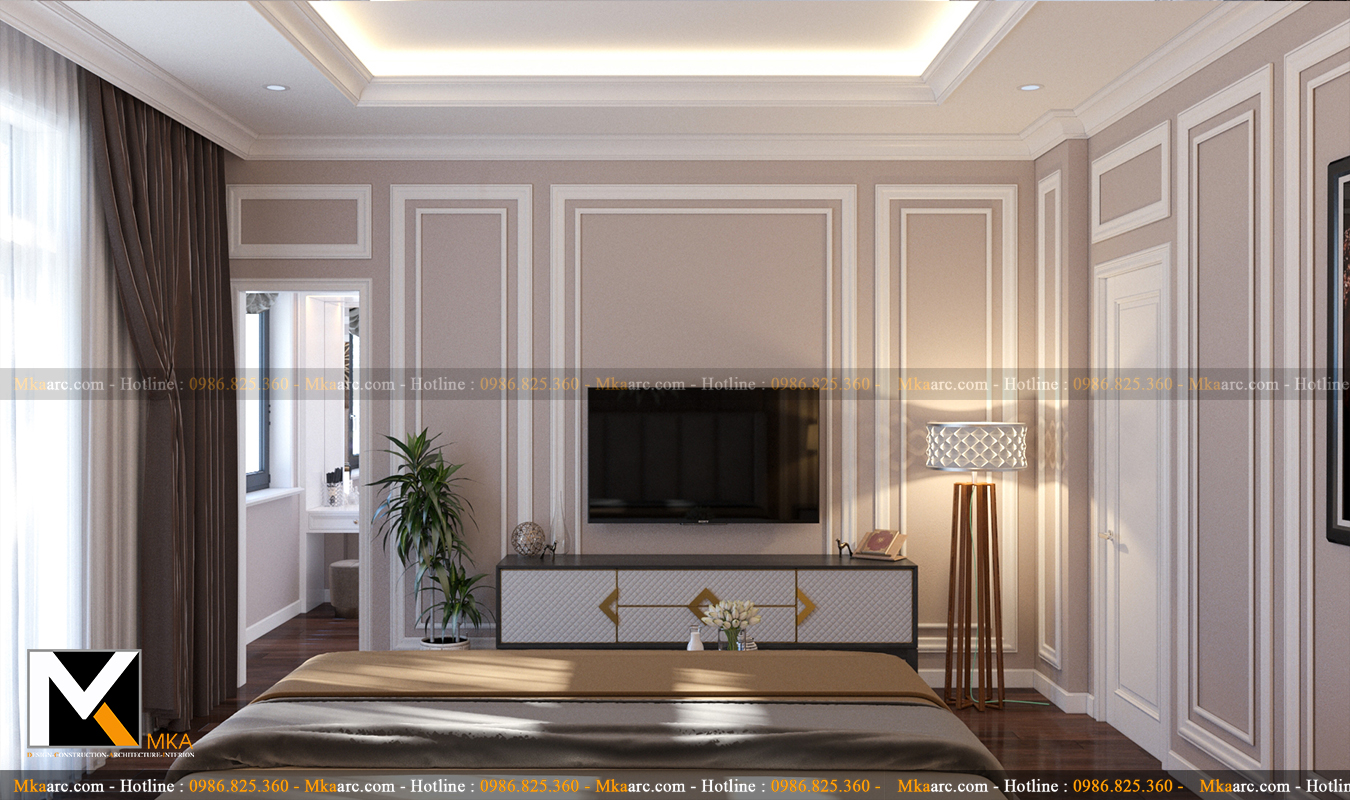 Khi thiết kế nội thất biệt thự tân cổ điển , đội ngũ KTS đã cố gắng đưa ra giải pháp tiện nghi và tối giản nhất cho không gian nghỉ ngơi chính của gia chủ tại phòng ngủ . Đồ nội thất trong căn phòng này bao gồm có giường ngủ, tab đầu giường, tủ quần áo âm tường, bàn trang điểm.