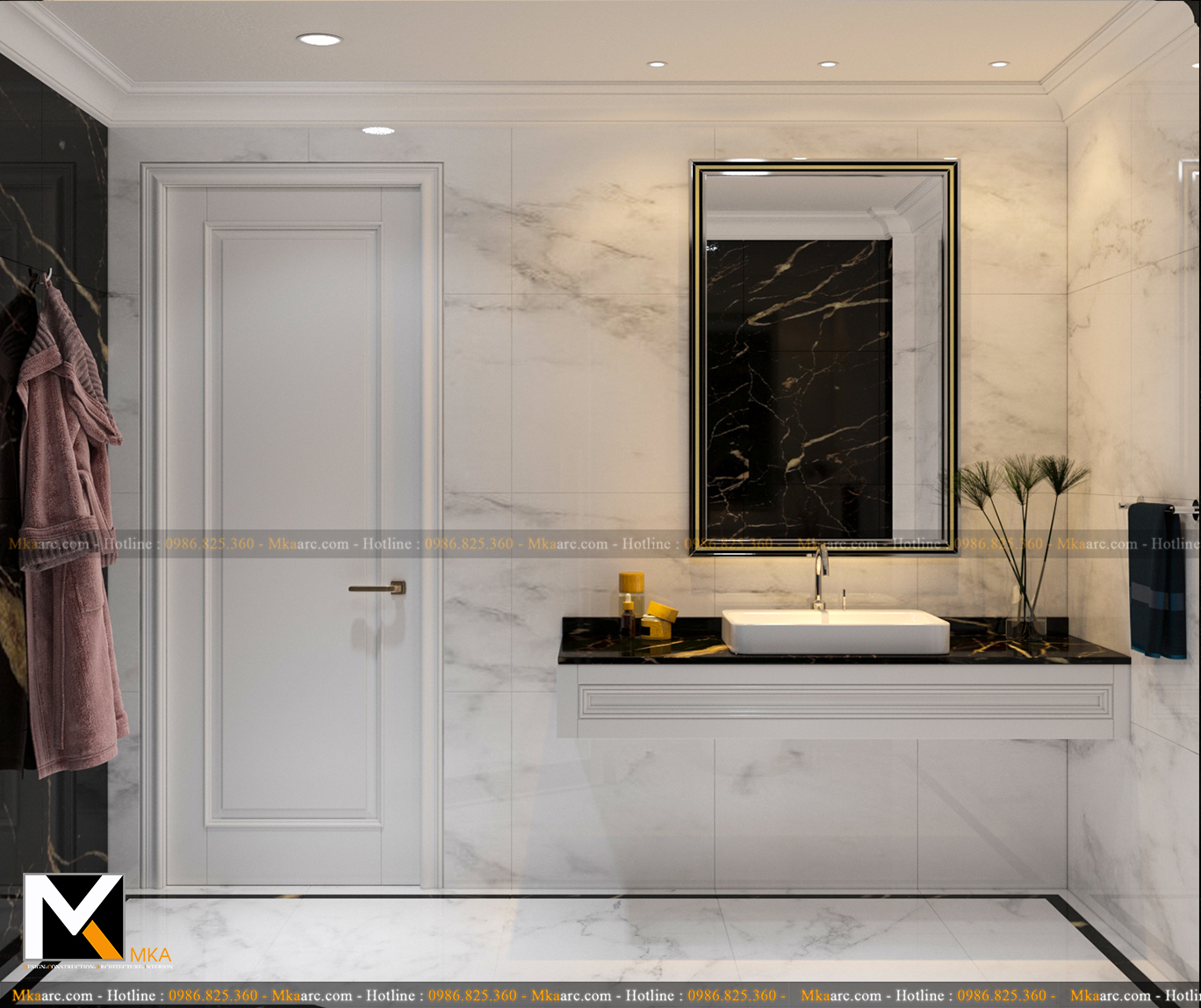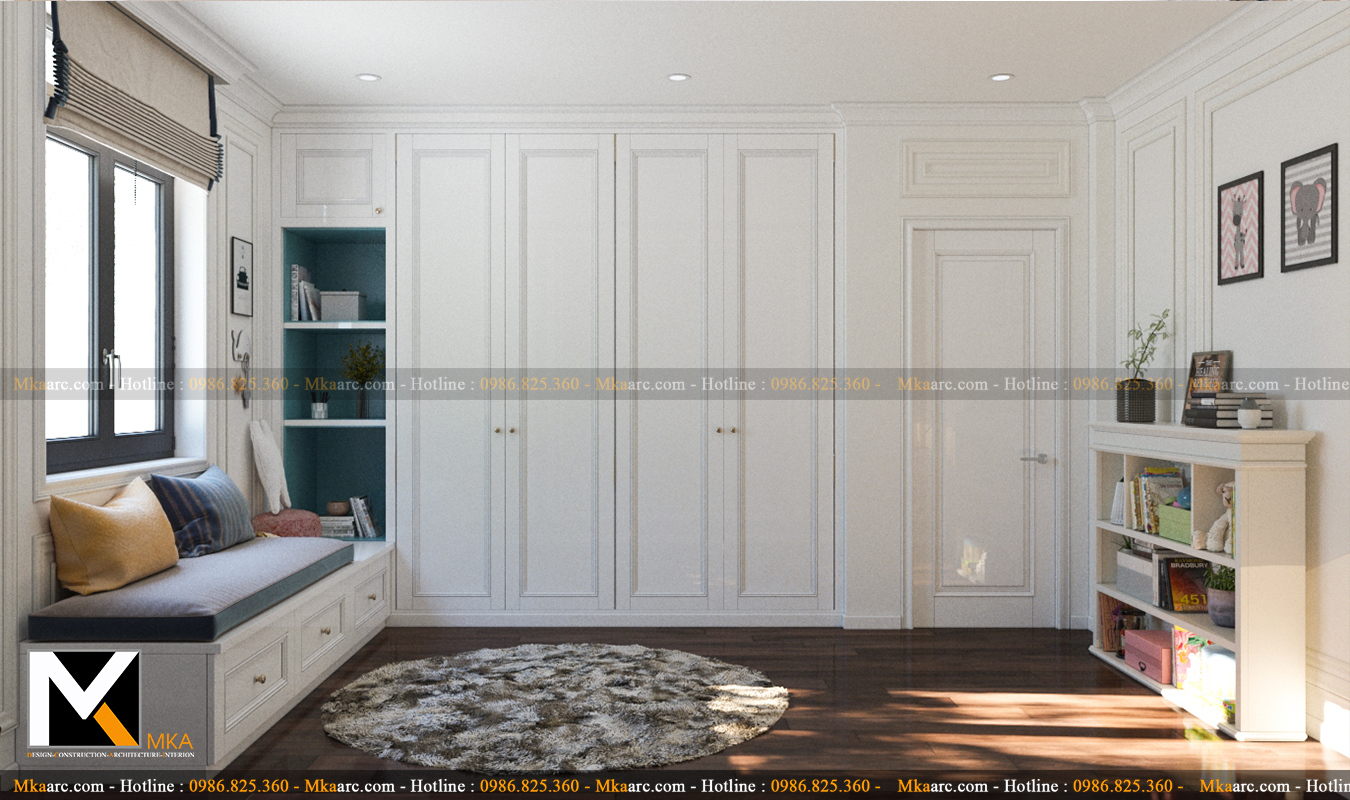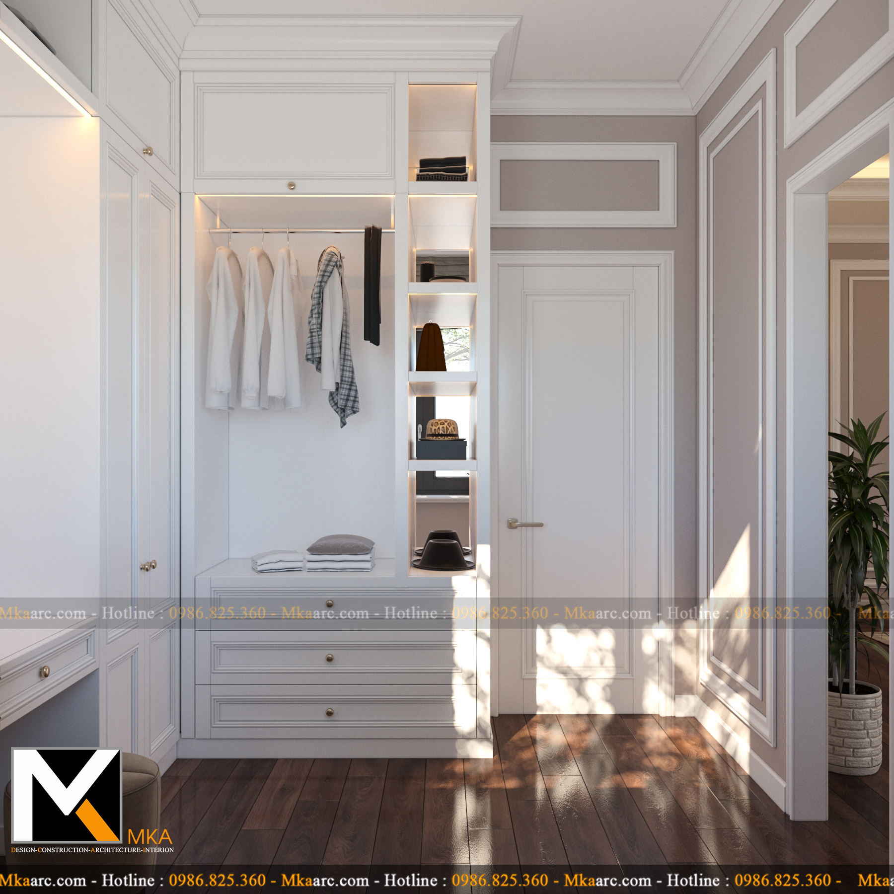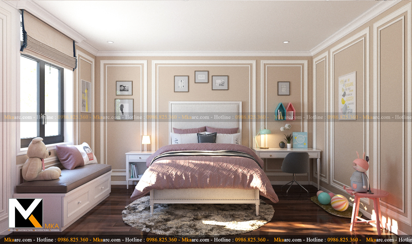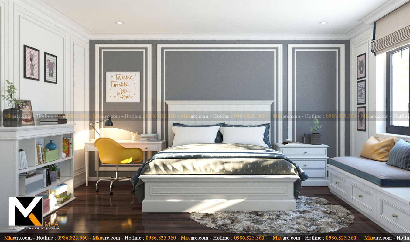 Khi thiết kế nội thất biệt thự tân cổ điển , đội ngũ KTS đã cố gắng đưa ra giải pháp tiện nghi và tối giản nhất cho không gian nghỉ ngơi chính của gia chủ tại phòng ngủ . Đồ nội thất trong căn phòng này bao gồm có giường ngủ, tab đầu giường, tủ quần áo âm tường, bàn trang điểm.