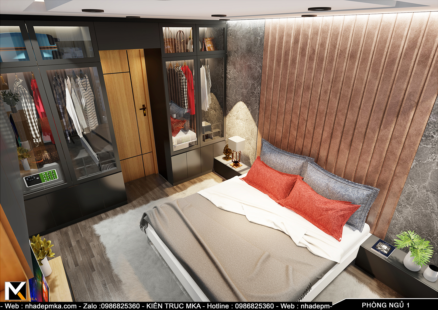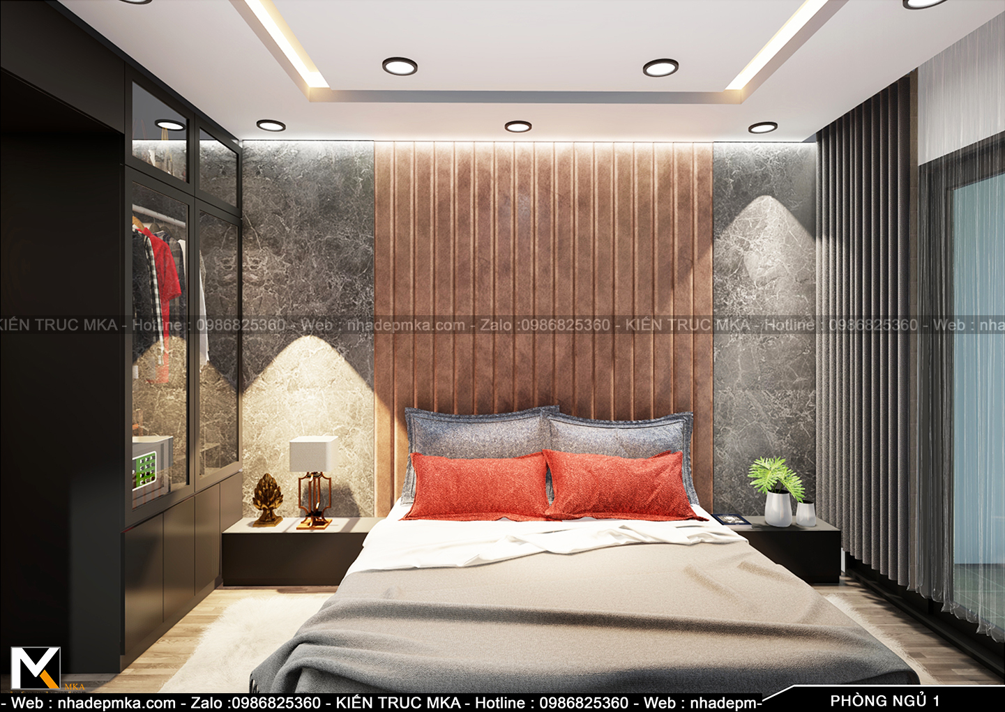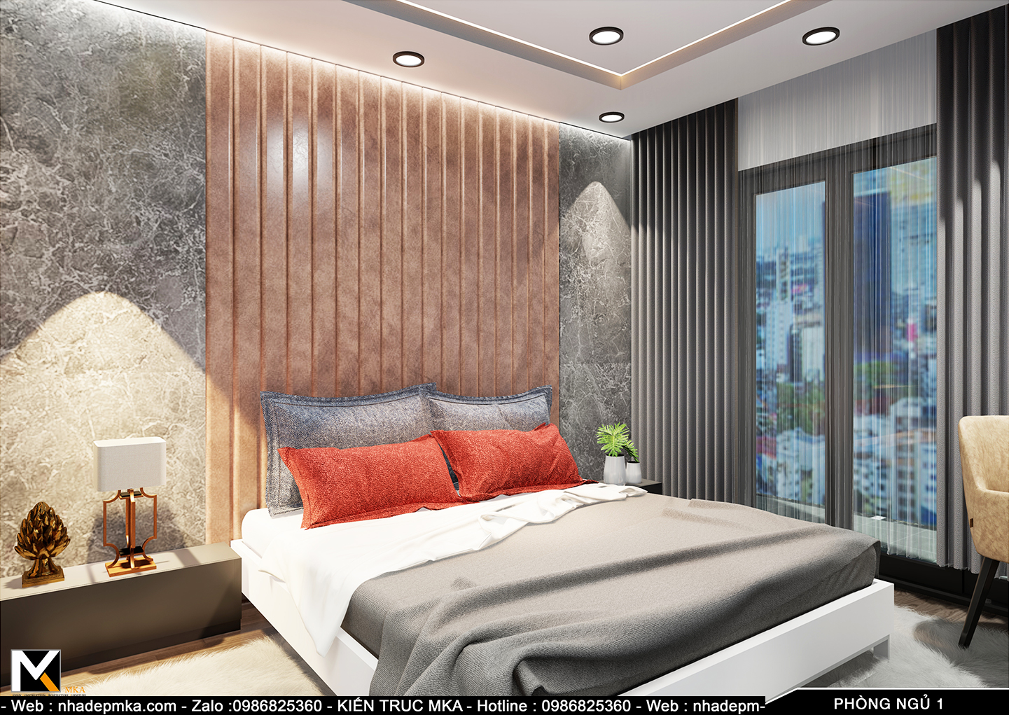 Giường ngủ đặt chính giữa phòng, sử dụng loại giường với phần nệm da khổ lớn cao cấp, đem lại những giấc ngủ cực kỳ chất lượng và sảng khoái.
