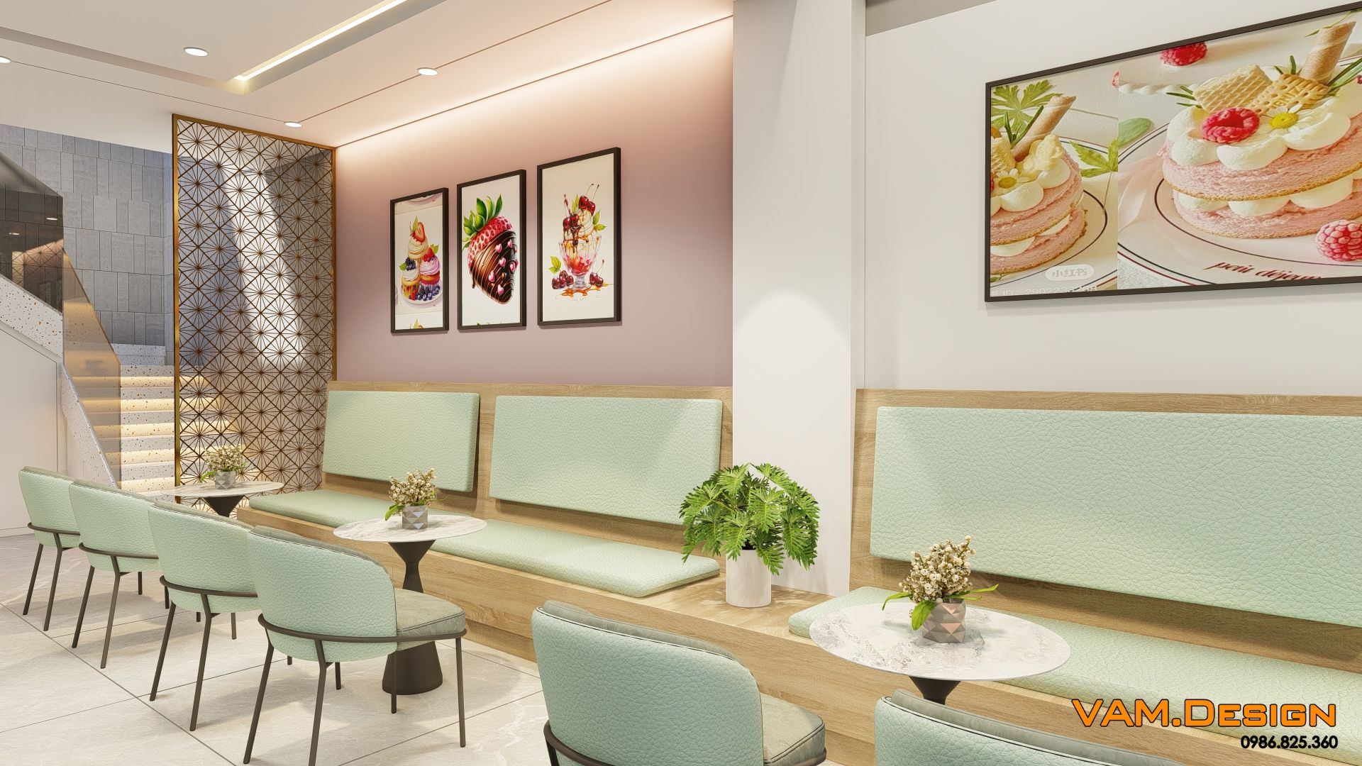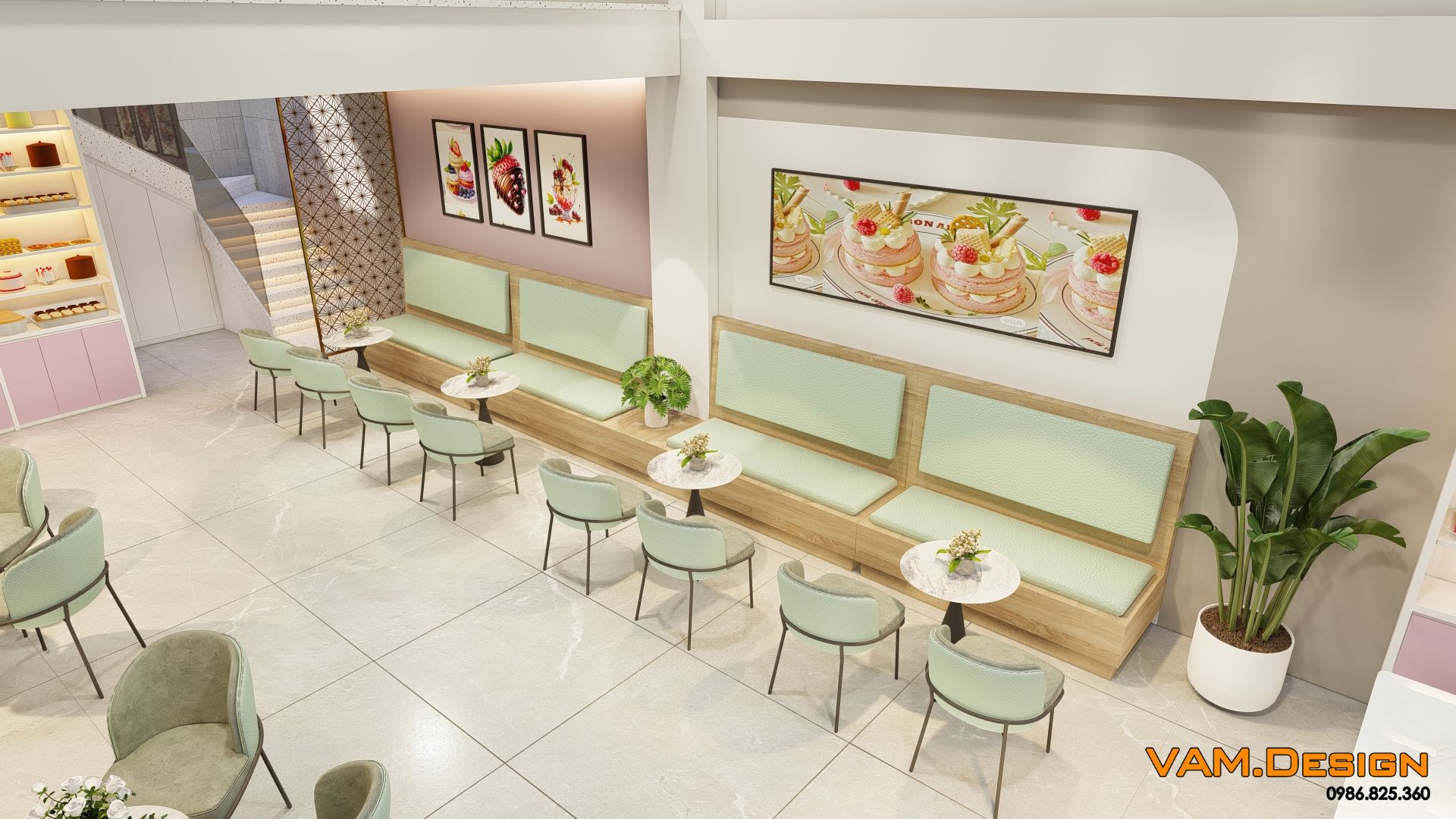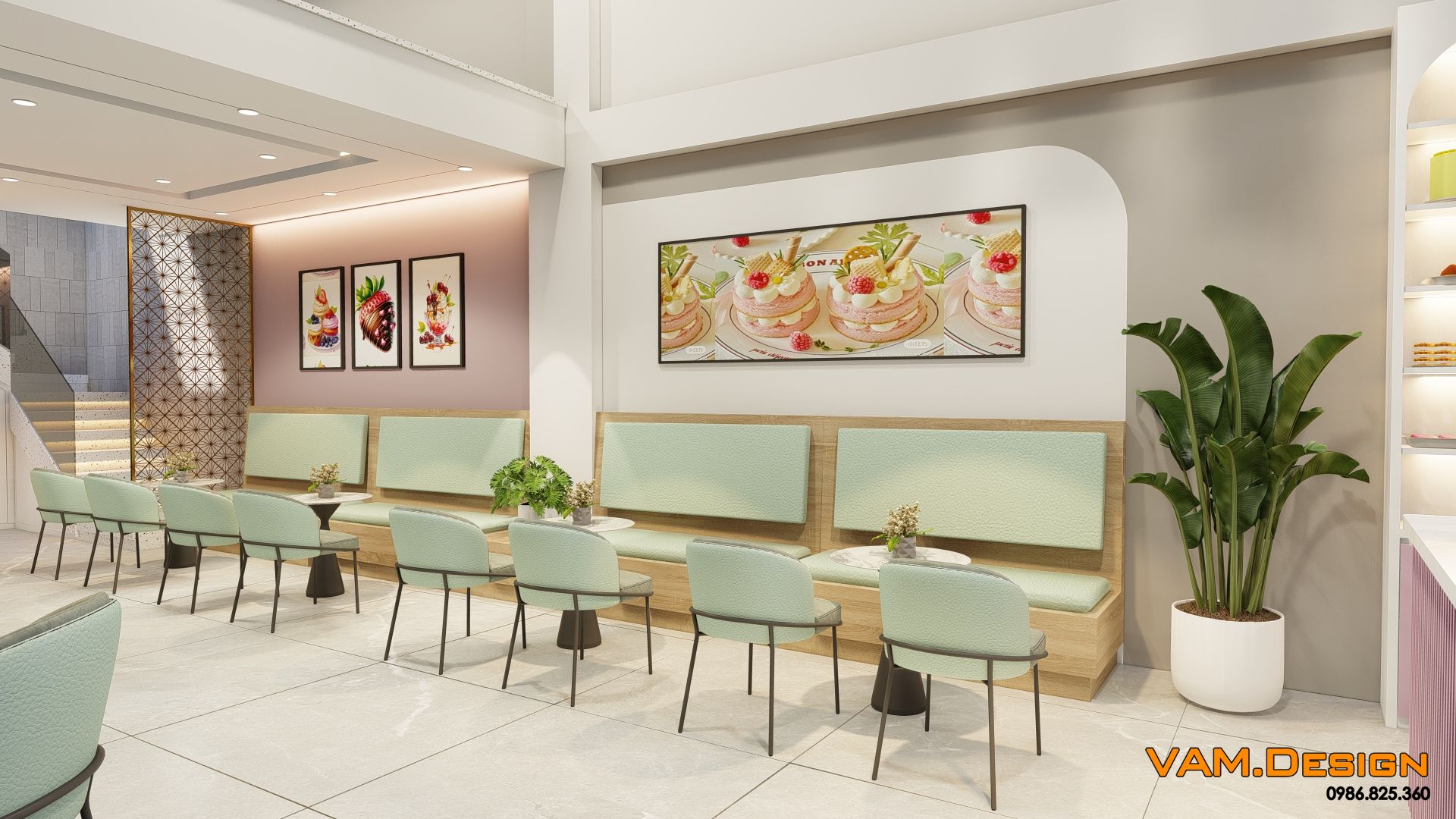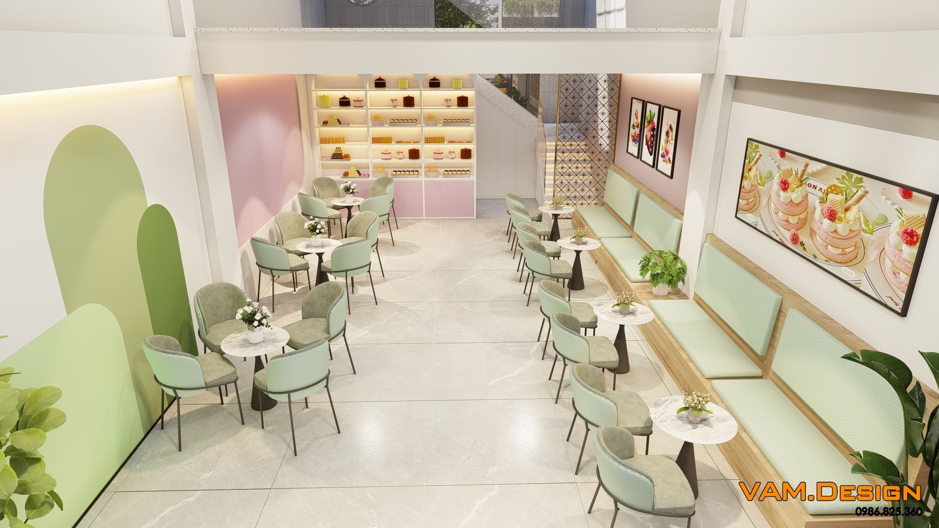 Nội thất khu vực khách ngồi được thiết kế tinh tế với sự kết hợp hài hòa của các gam màu trung tính và pastel. Bàn ghế được chọn lựa cẩn thận, với ghế đệm màu xanh ngọc nhạt và khung kim loại mảnh, tạo cảm giác thanh thoát và hiện đại. Những chiếc bàn tròn nhỏ gọn phù hợp cho các cặp đôi hoặc nhóm bạn nhỏ. Một mảng tường lớn được trang trí bằng tranh treo tường có hình ảnh bánh ngọt, tăng thêm tính thẩm mỹ và nhận diện thương hiệu.