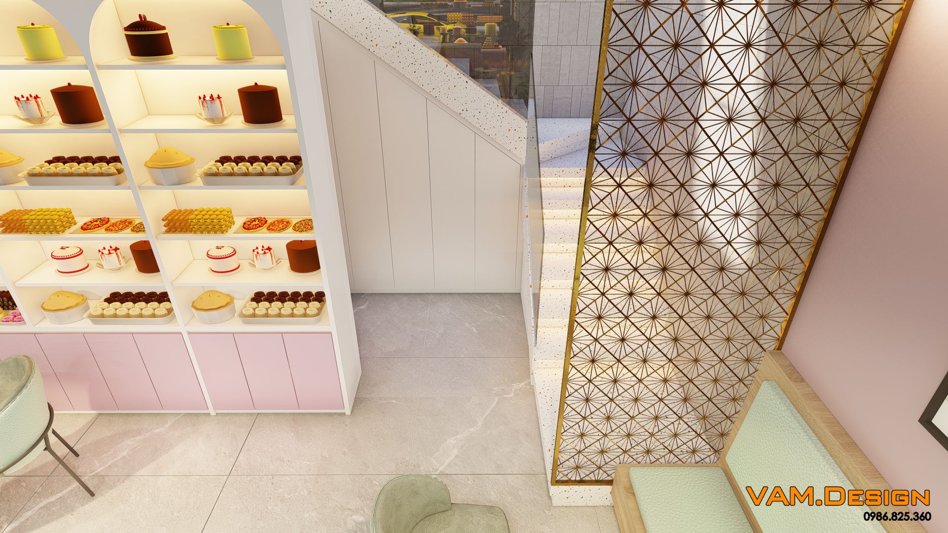 Khu vực trưng bày bánh được thiết kế làm tâm điểm của tiệm. Quầy bánh với mặt đá trắng sang trọng nổi bật trên nền tủ màu hồng pastel có họa tiết sọc dọc, tạo cảm giác mềm mại và hiện đại.