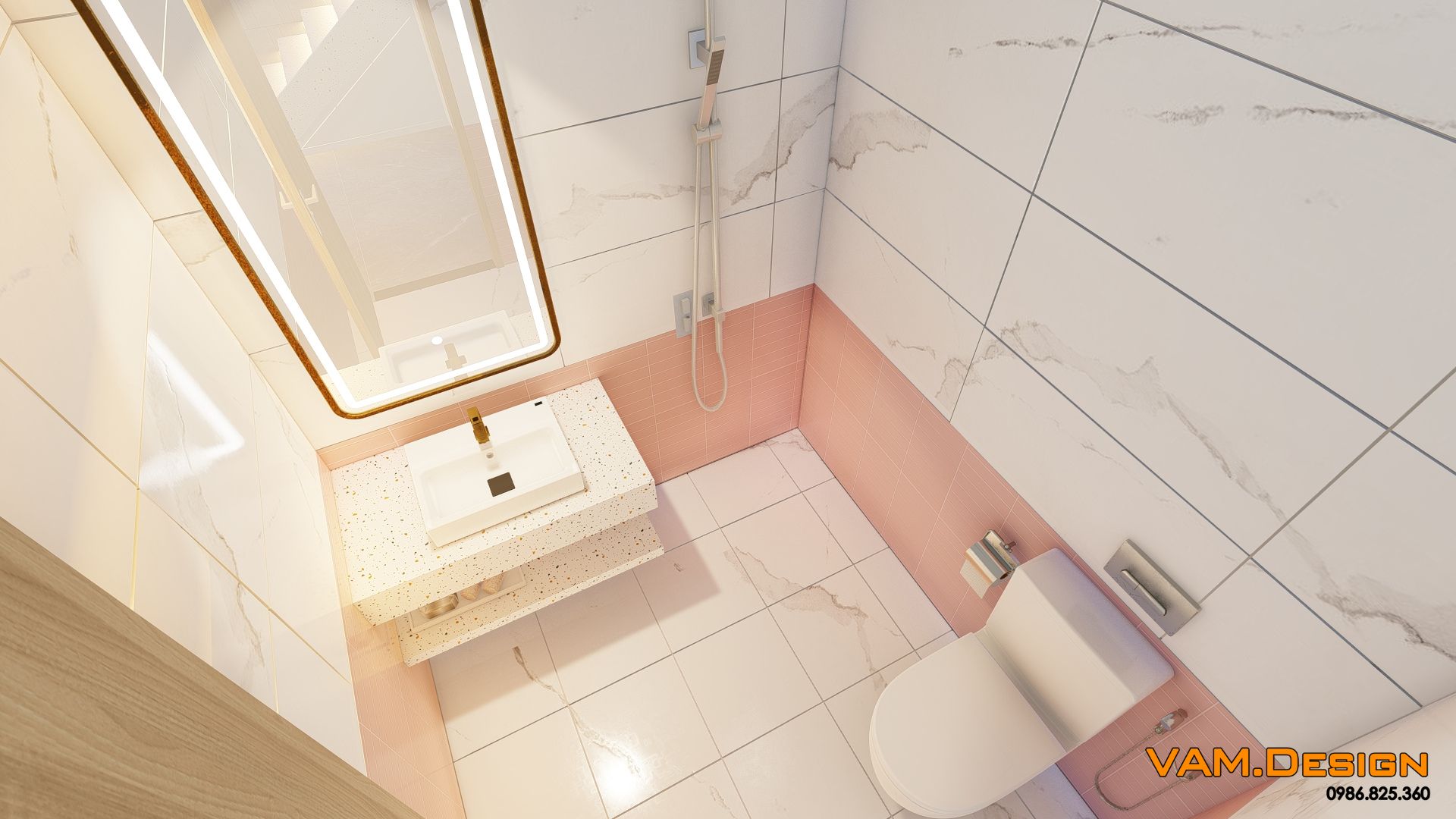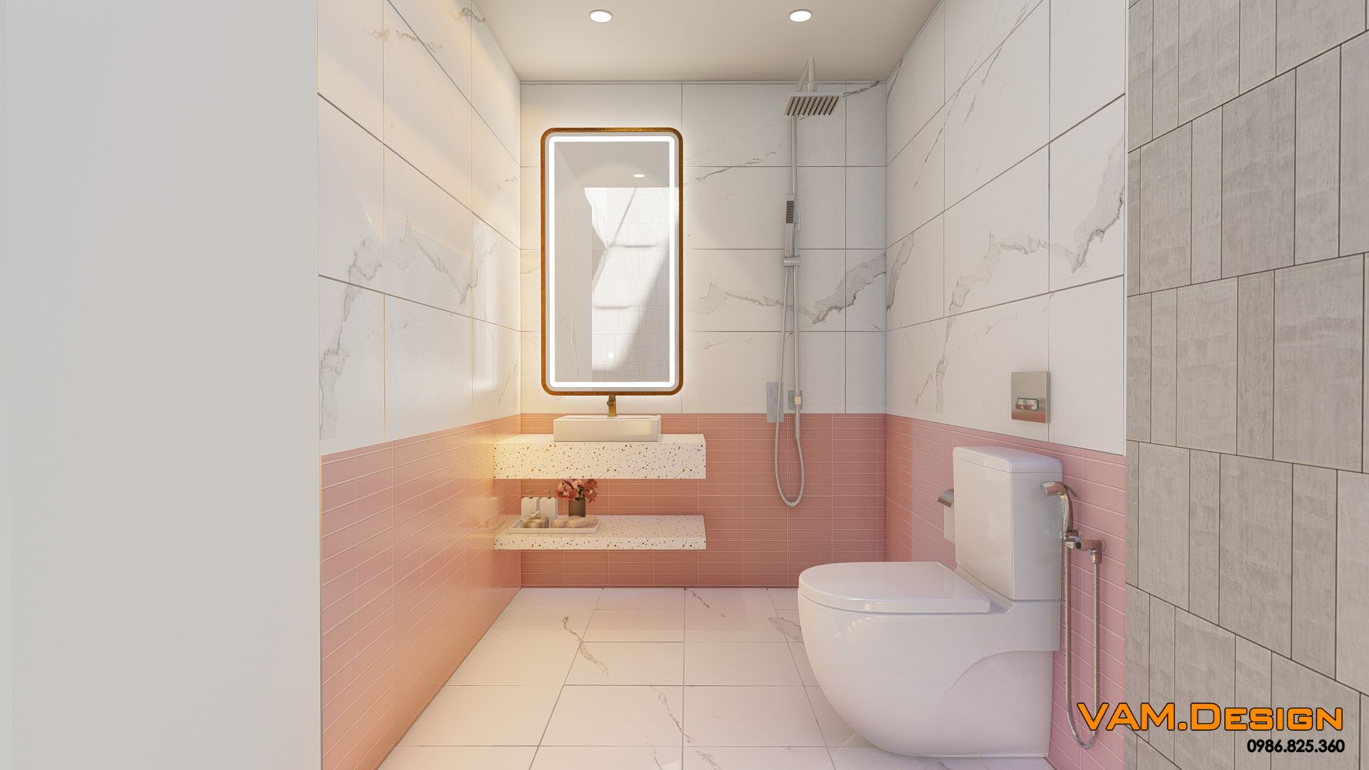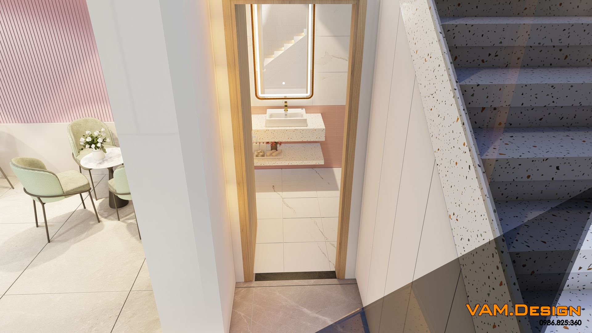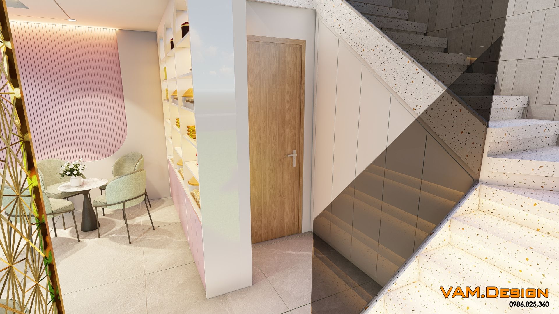Cách sử dụng vật liệu cũng rất thông minh. Sàn gạch men trắng, tường ốp lam sóng màu hồng nhạt và kệ trưng bày bằng kính đều góp phần tạo cảm giác sạch sẽ, rộng rãi và hiện đại cho toàn bộ không gian.