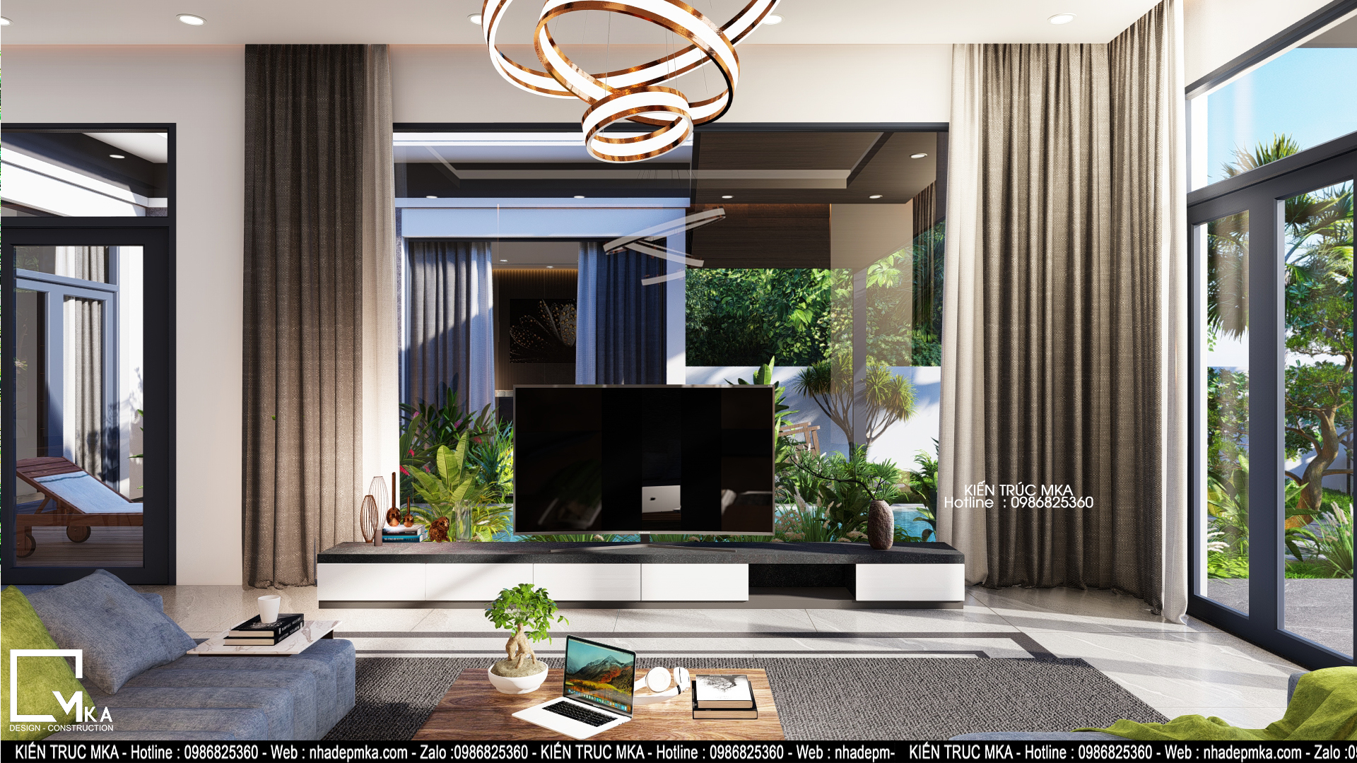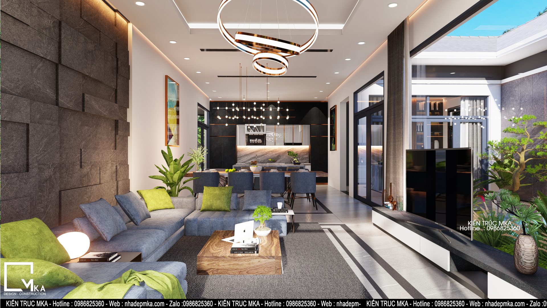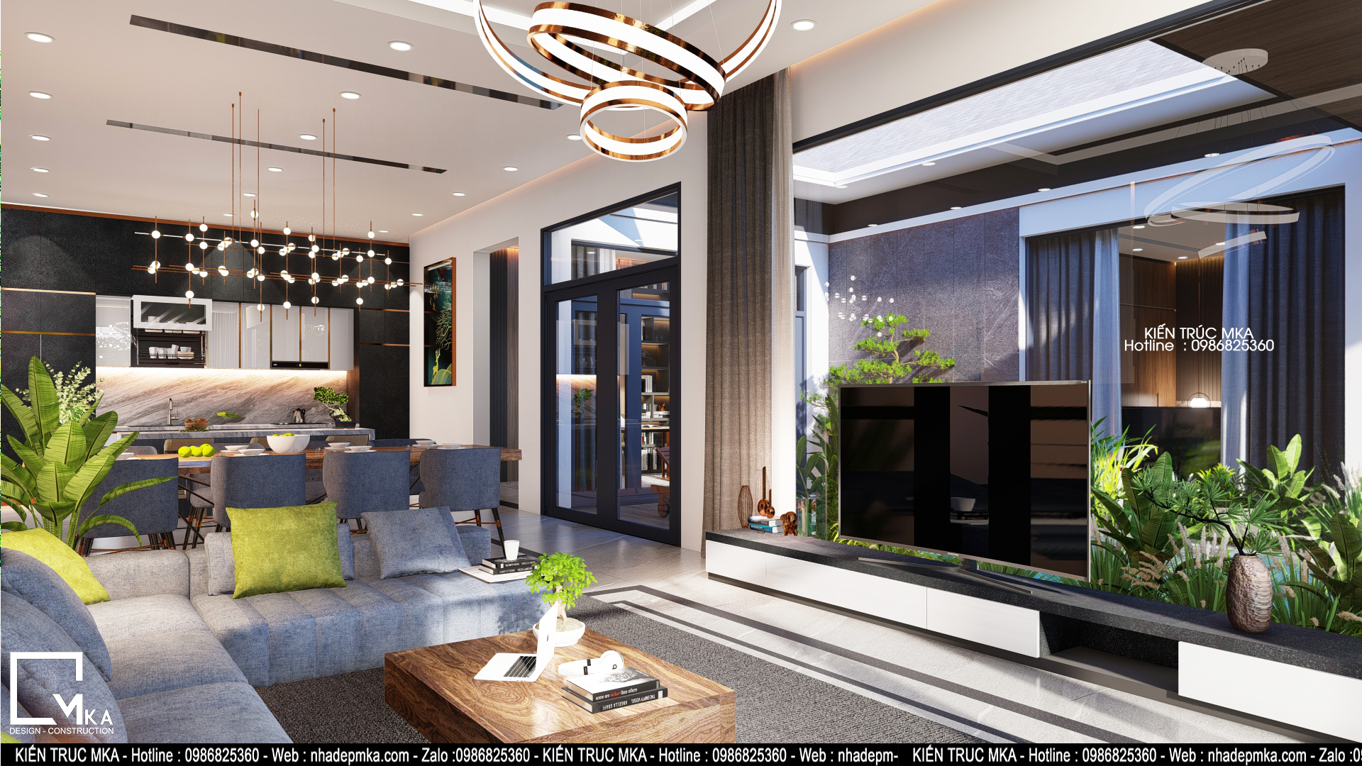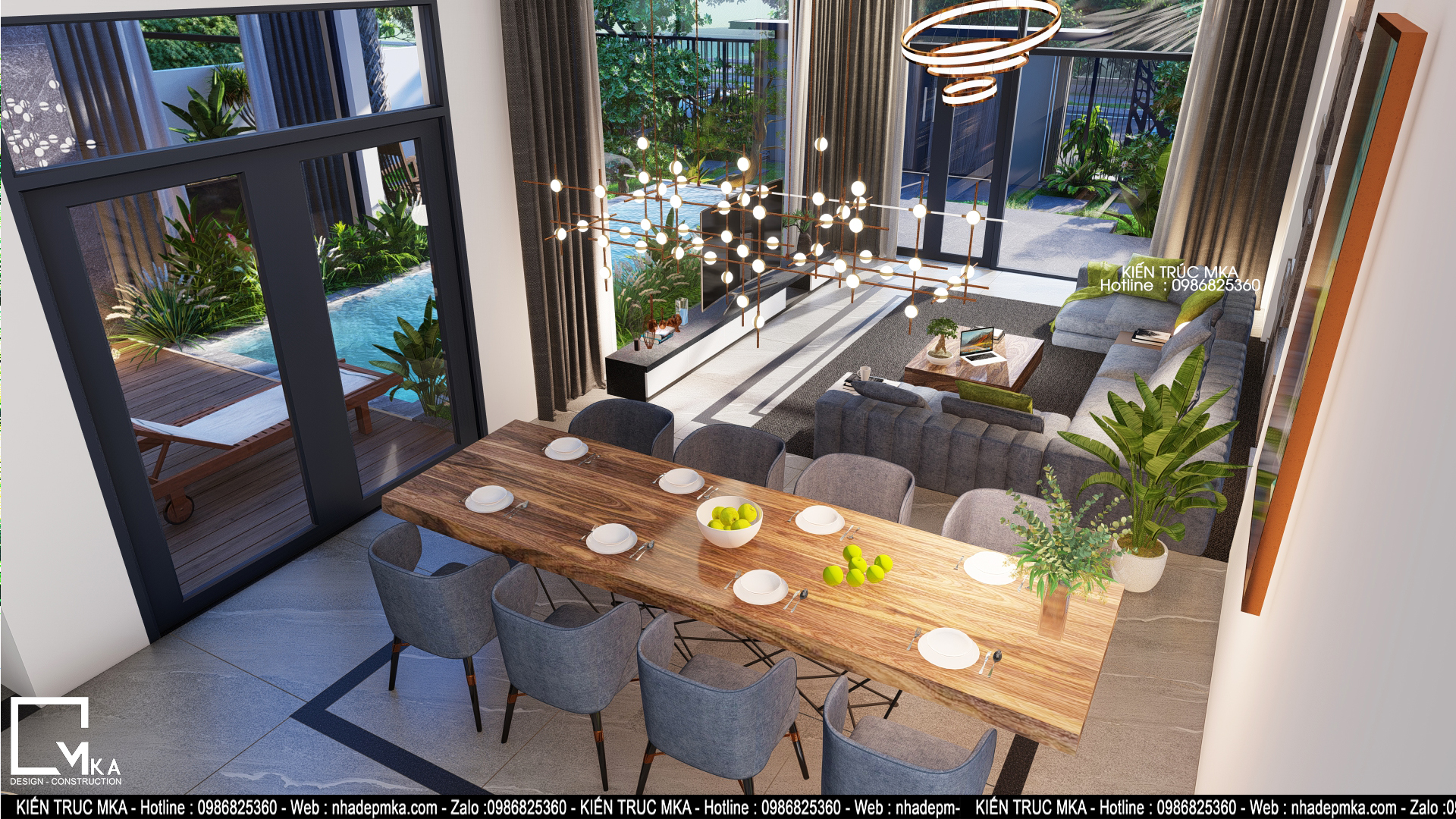 Nội thất phòng khách được thiết kế với không gian mở với view nhìn ra hồ bơi và sân trước. Với tông màu chủ đạo là màu trắng của tường và trần kết hợp củng màu tối của nội thất làm cho không gian vờ rộng rải lại rất sang trọng. Để Thiết kế thi công nội thất biệt thự vườn này đảm bảo tối ưu về không gian MKA đã chọn hình thức không gian mở để bếp phòng ăn và phòng khách liên thông nhau.