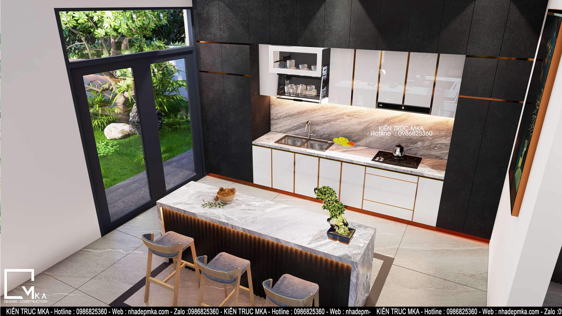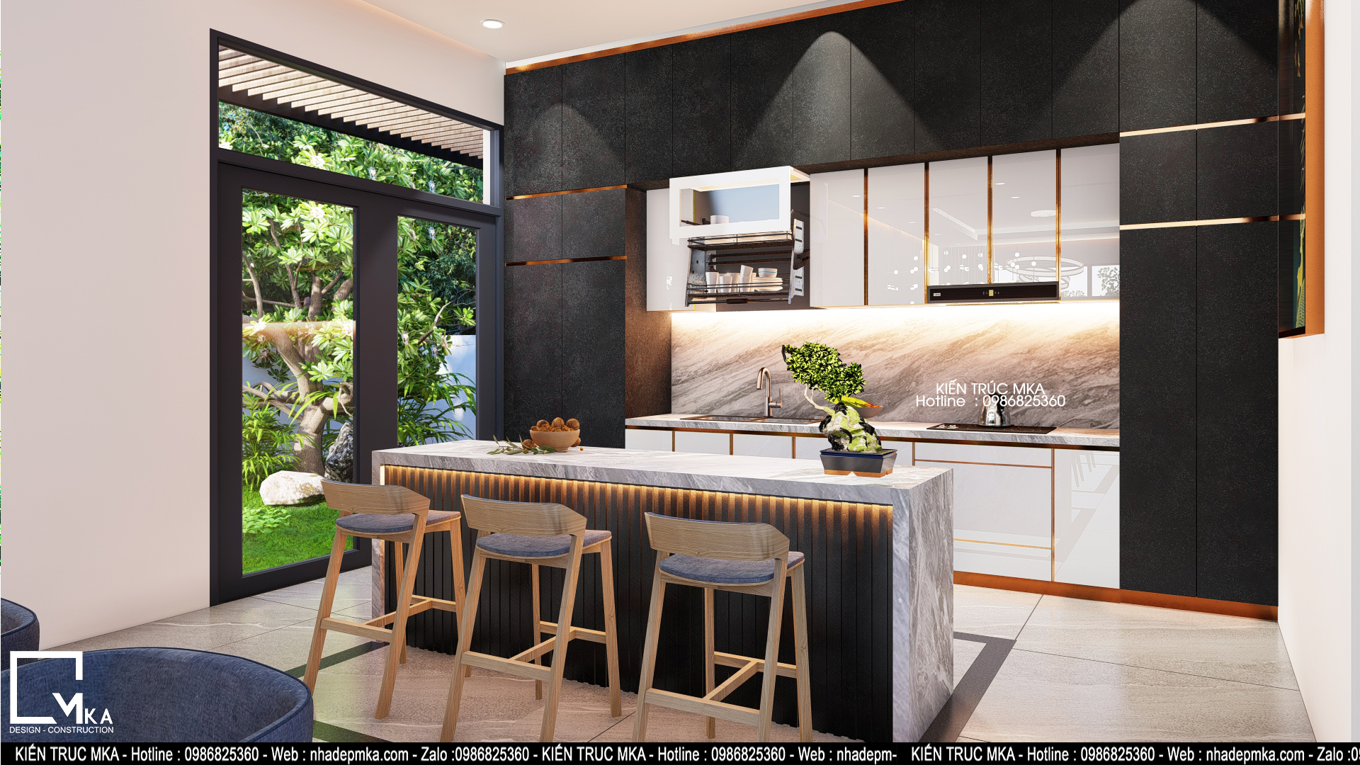 Thiết kế thi công nội thất biệt thự vườn này đảm bảo thẩm mỹ cho nội thất căn nhà đội ngủ thiết kế thi công của MKA đã chọn vật liệu Laminate và Agrilic làm 2 vật liệu chủ đạo cho các hệ tủ trong nội thất. Tủ bếp được phối bới màu trắng của agrilic và màu đen của Laminate ,2 màu sắc tương phản làm nổi bật không gia bếp. Với 1 quầy bar ở giữa là điểm nhấ cho căn bếp và là nơi gia chủ có thể nhâm nhi ly rượu .