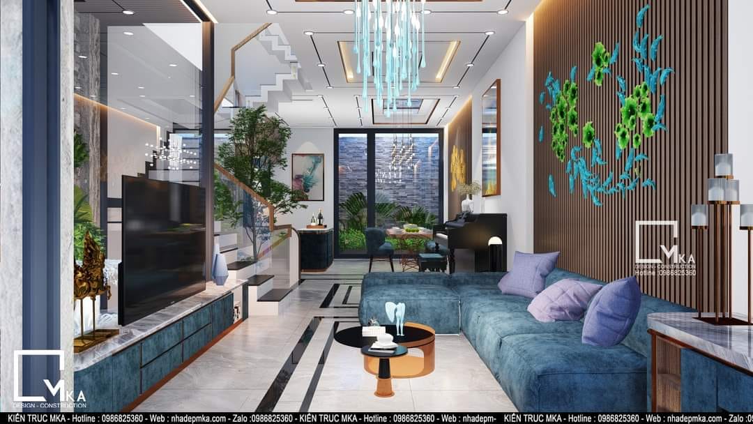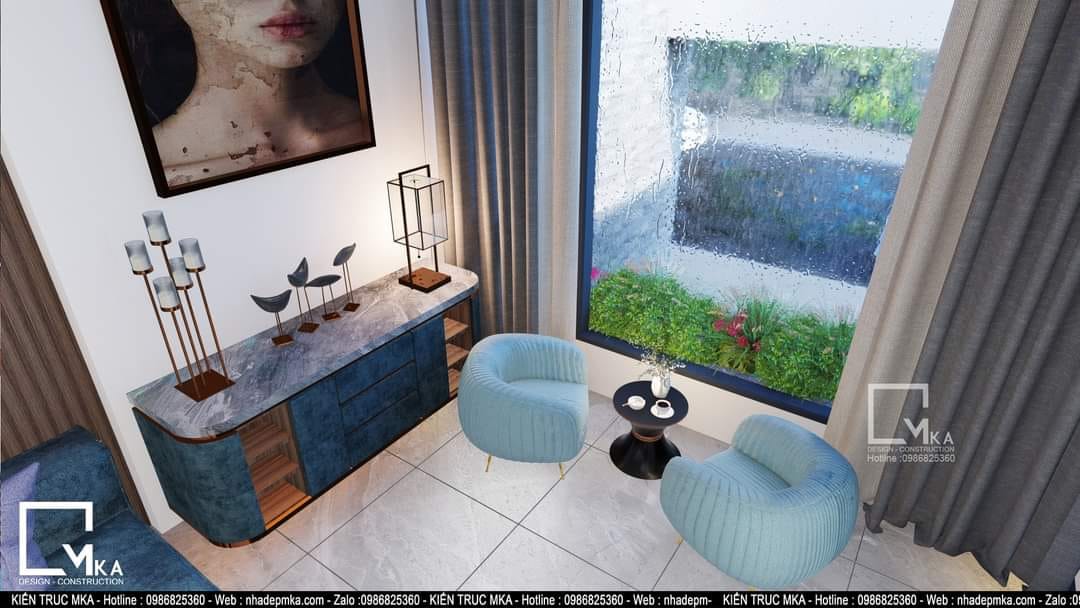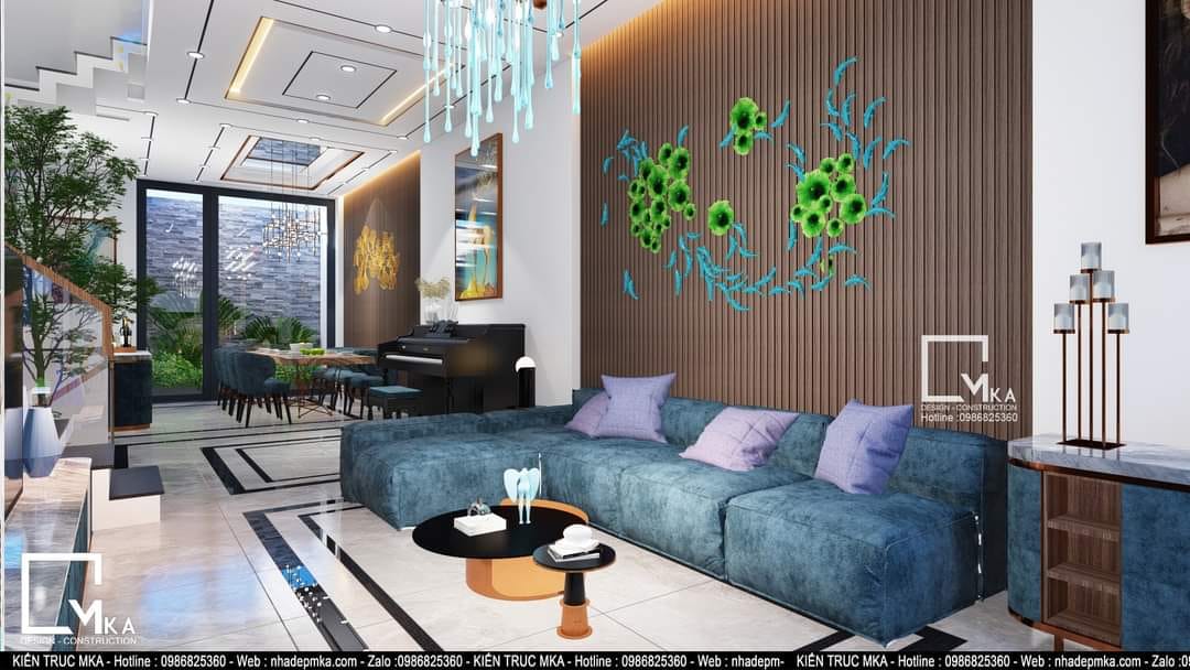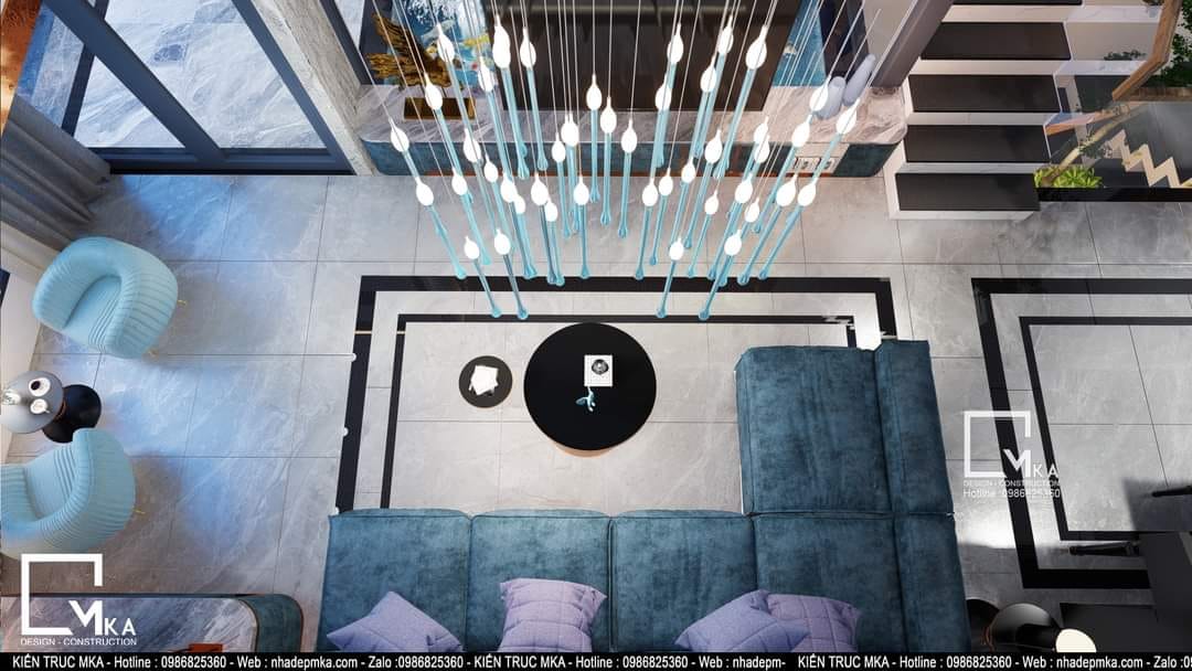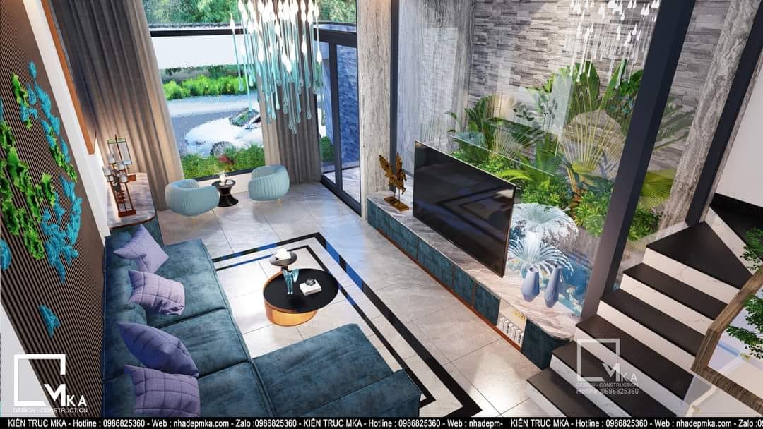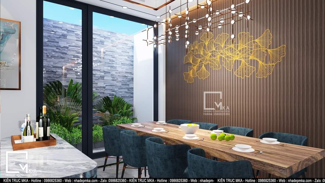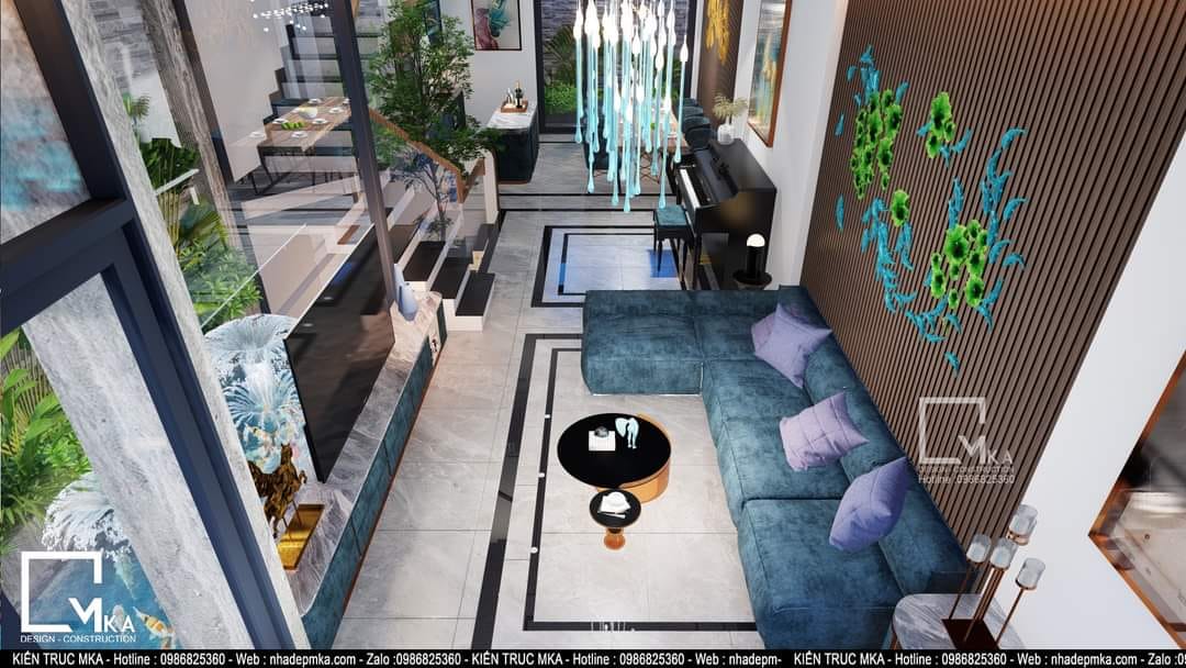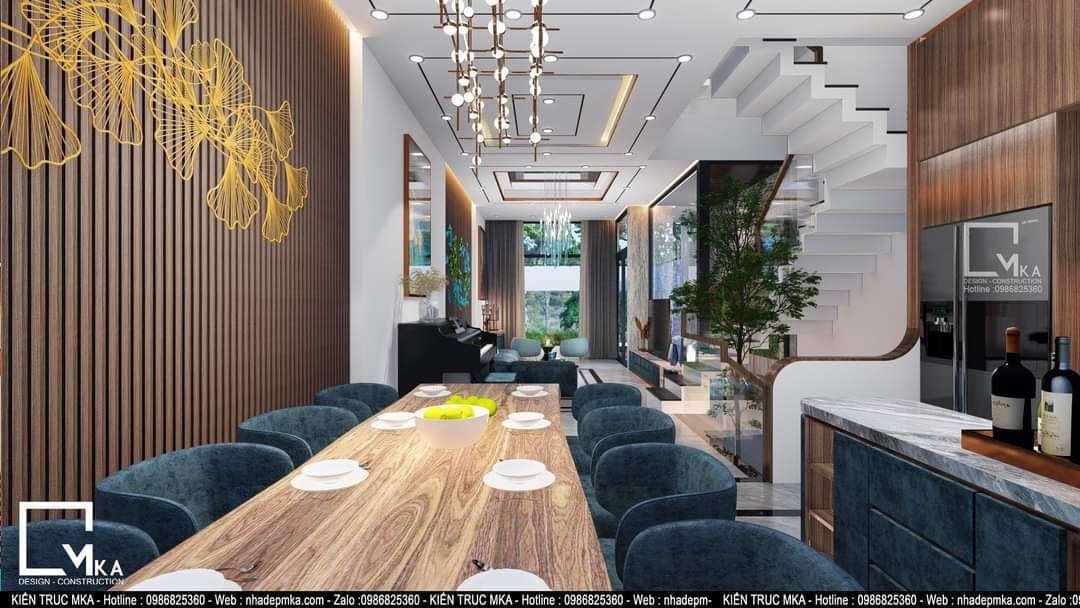 Nội thất nhà phố 4 tầng này được thiết kế theo phòng cách hiện đại với tông màu sáng chủ đạo. Tất cả bàn ghế trong nhà được bọc da . Tầng trệt của căn nhà với 60m2 MKA chỉ bố trí phòng khách bếp và ăn. Cùng với 3 không gian chính đấy thì MKA đa đưa hồ koi vào phòng khách tạo nên 1 không gian phòng khách thông thoáng hòa cùng thiên nhiên. Sau những giờ làm việc mệt mõi thì gia chủ có thể ngồi thư giản với hồ koi.