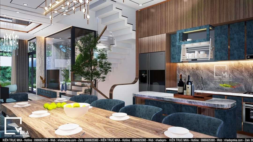 Ở khu vực cầu thang sẽ kết hợp giếng trời và dk trồng 1 cây xanh vươn từ tầng hầm lên. Đối diện cầu thang là nơi bố trí đàn piano .Gia chủ chủ co thể vừa nấu ăn vừa nghe con cái của họ chơi đàn.