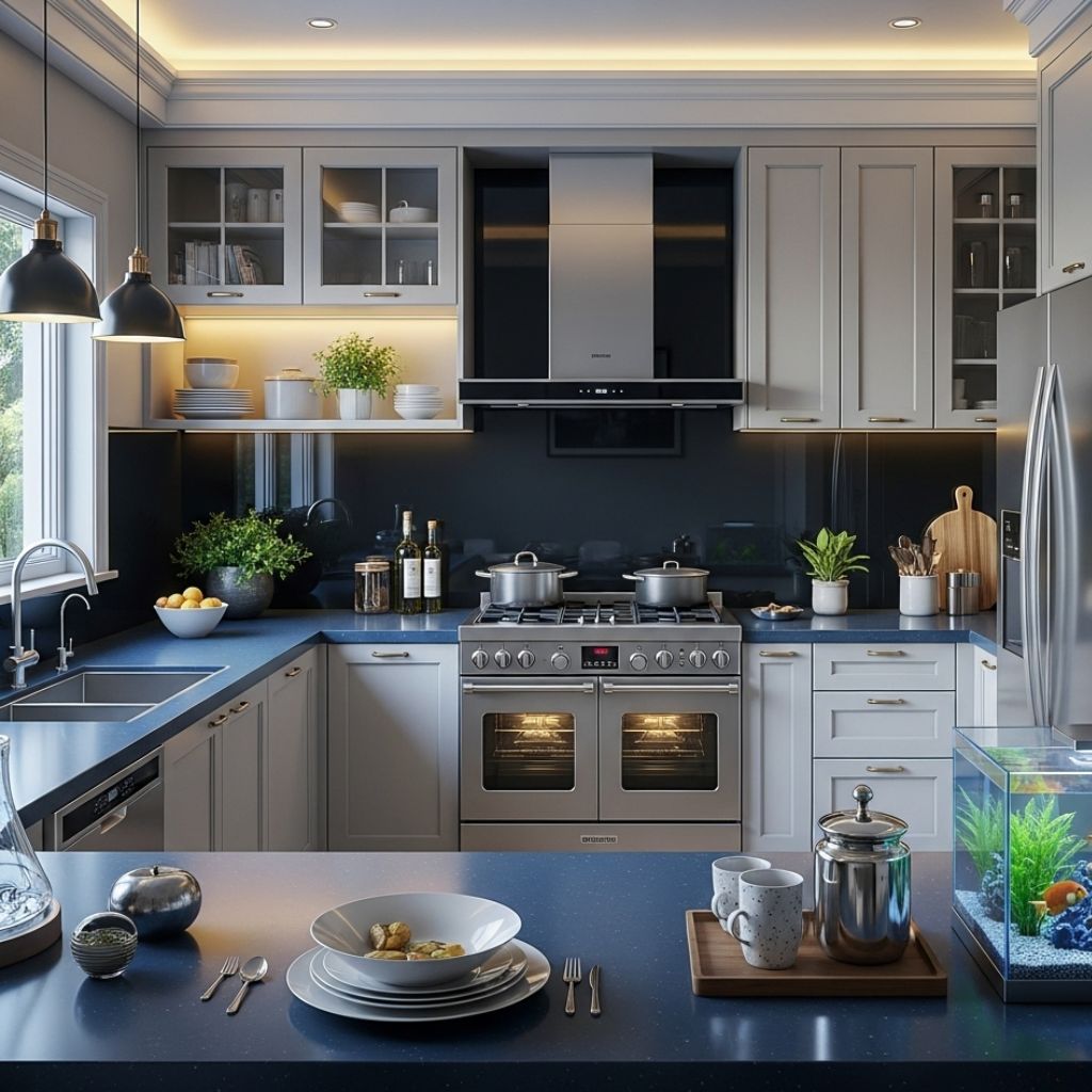 - Màu tương hợp (Thủy hợp Thủy): Các màu xanh dương (xanh nước biển) và đen cũng rất hợp với mệnh Thủy của bạn. Chúng tạo cảm giác rộng rãi, mát mẻ, sâu sắc và mang lại sự bình yên, ổn định. Một chút nhấn nhá màu xanh dương ở gạch ốp tường, tủ bếp hoặc các phụ kiện cũng đủ làm căn bếp thêm phần sinh động và thịnh vượng.