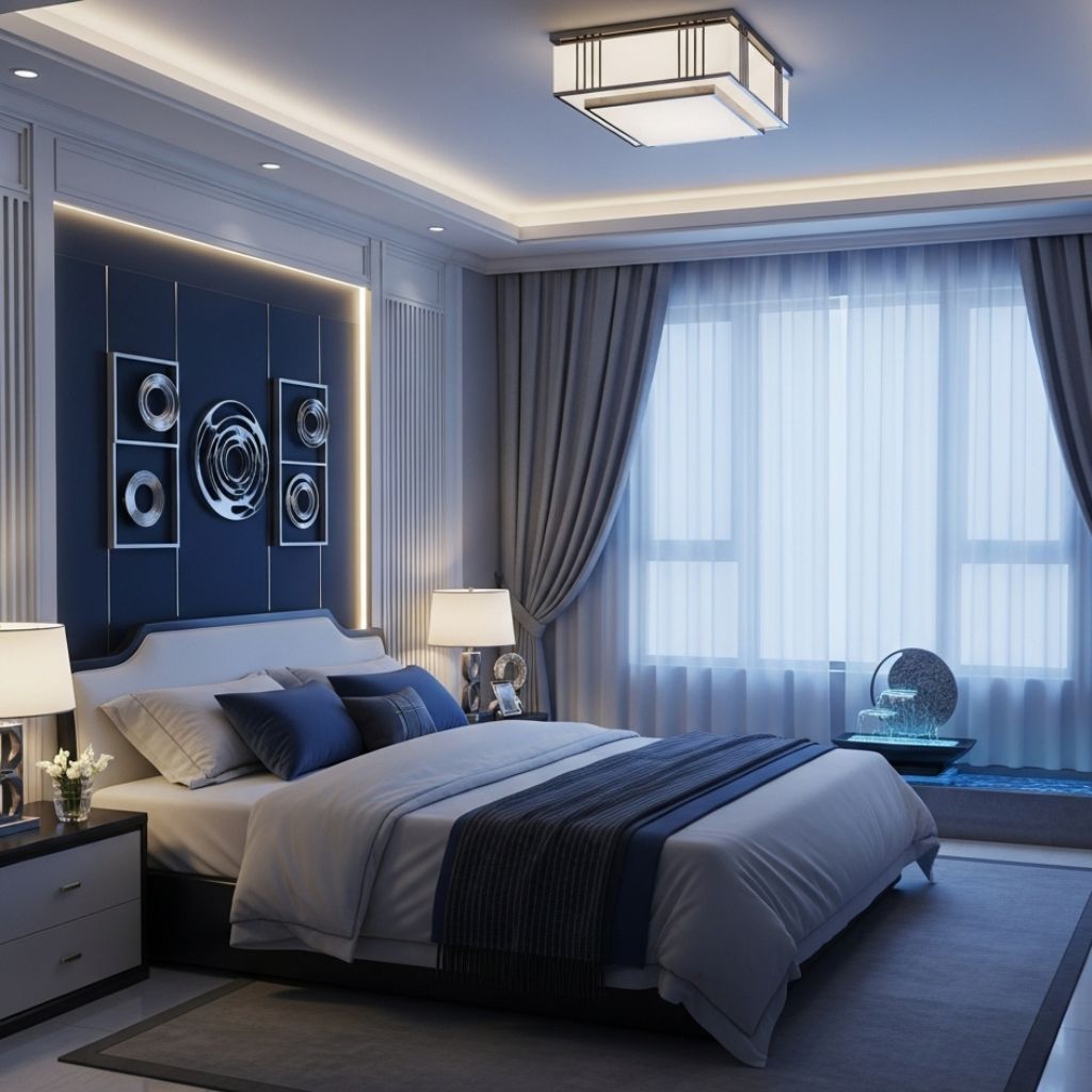 - Màu tương hợp (Thủy hợp Thủy): Các màu xanh dương (từ xanh nhạt, xanh da trời đến xanh nước biển sâu) và đen cũng rất phù hợp. Chúng tạo cảm giác mát mẻ, sâu lắng, yên bình, giúp tâm hồn thư thái và mang lại giấc ngủ ngon hơn. Tuy nhiên, nên sử dụng màu đen một cách tiết chế, có thể làm điểm nhấn ở một bức tường nhỏ, họa tiết trên chăn ga hoặc một chiếc gối ôm, để tránh tạo cảm giác u tối, nặng nề cho phòng ngủ.