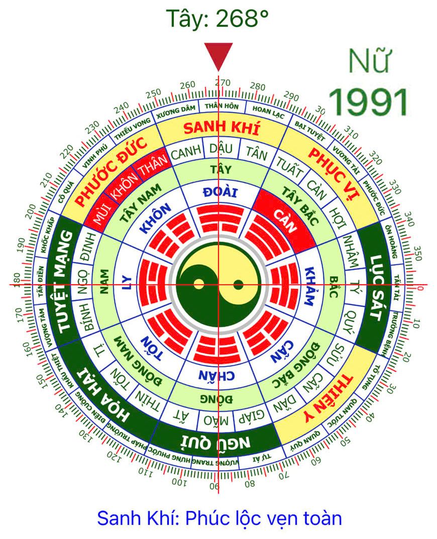 Nữ giới sinh năm 1991, tuổi Tân Mùi, có mệnh Lộ Bàng Thổ (Đất đường đi). Cung mệnh của bạn là Càn, thuộc Tây Tứ Mệnh.
