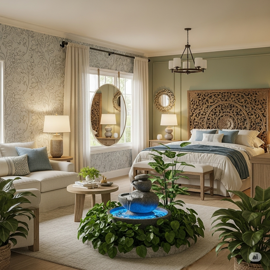 - Yếu tố nước (thận trọng): Hạn chế đặt bể cá hoặc bình nước lớn trong phòng ngủ, vì Thủy quá vượng có thể gây ẩm thấp và ảnh hưởng đến sức khỏe, đặc biệt là hệ hô hấp.