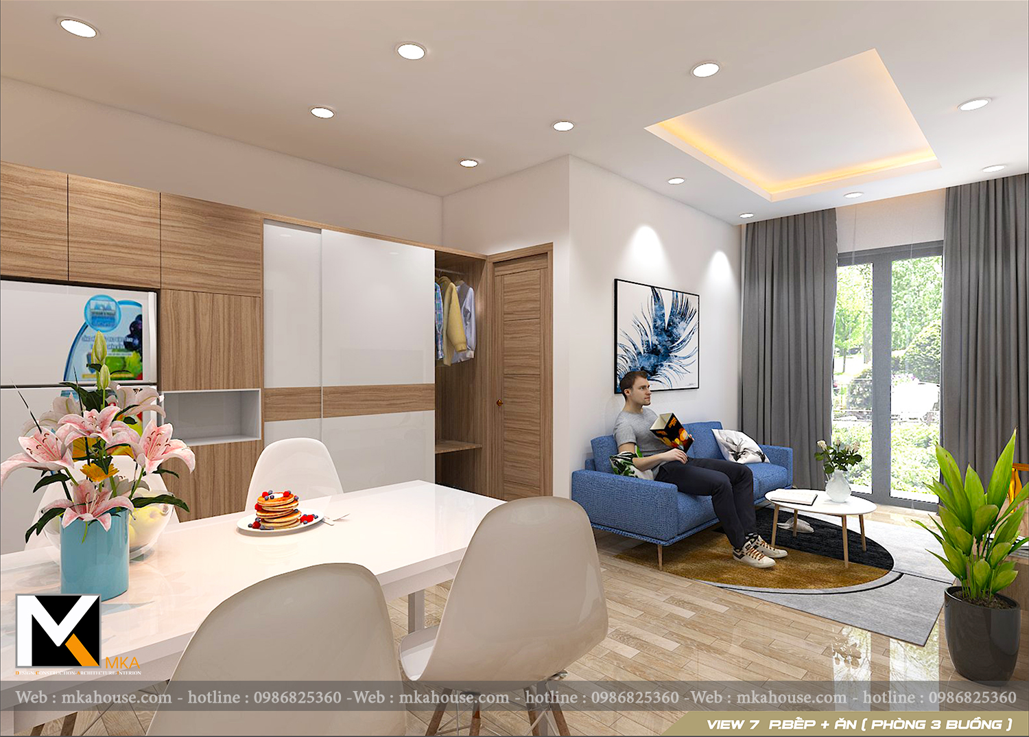 Bếp và bàn ăn tiện nghi, tủ lạnh được thiết kế âm tường tiết kiệm diện tích, và cửa kính nhìn ra vườn gần salon có rèm cho tiện lợi.