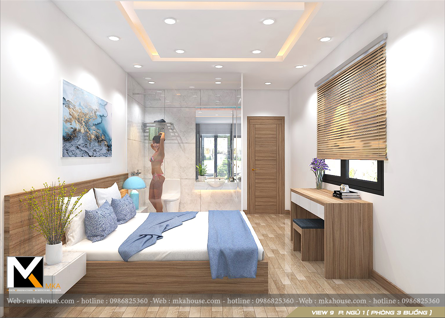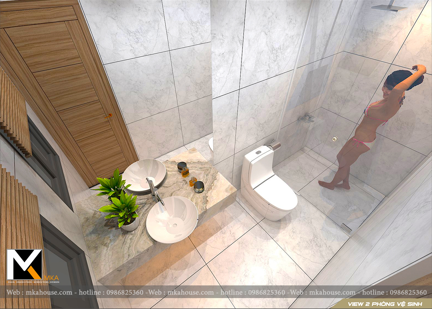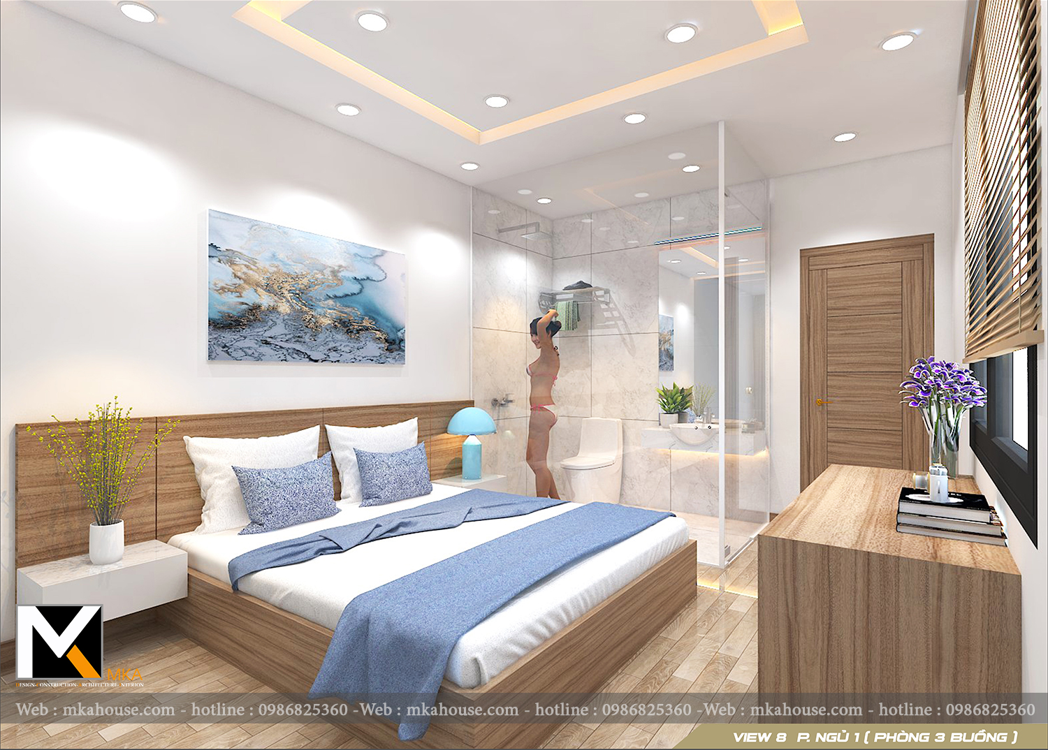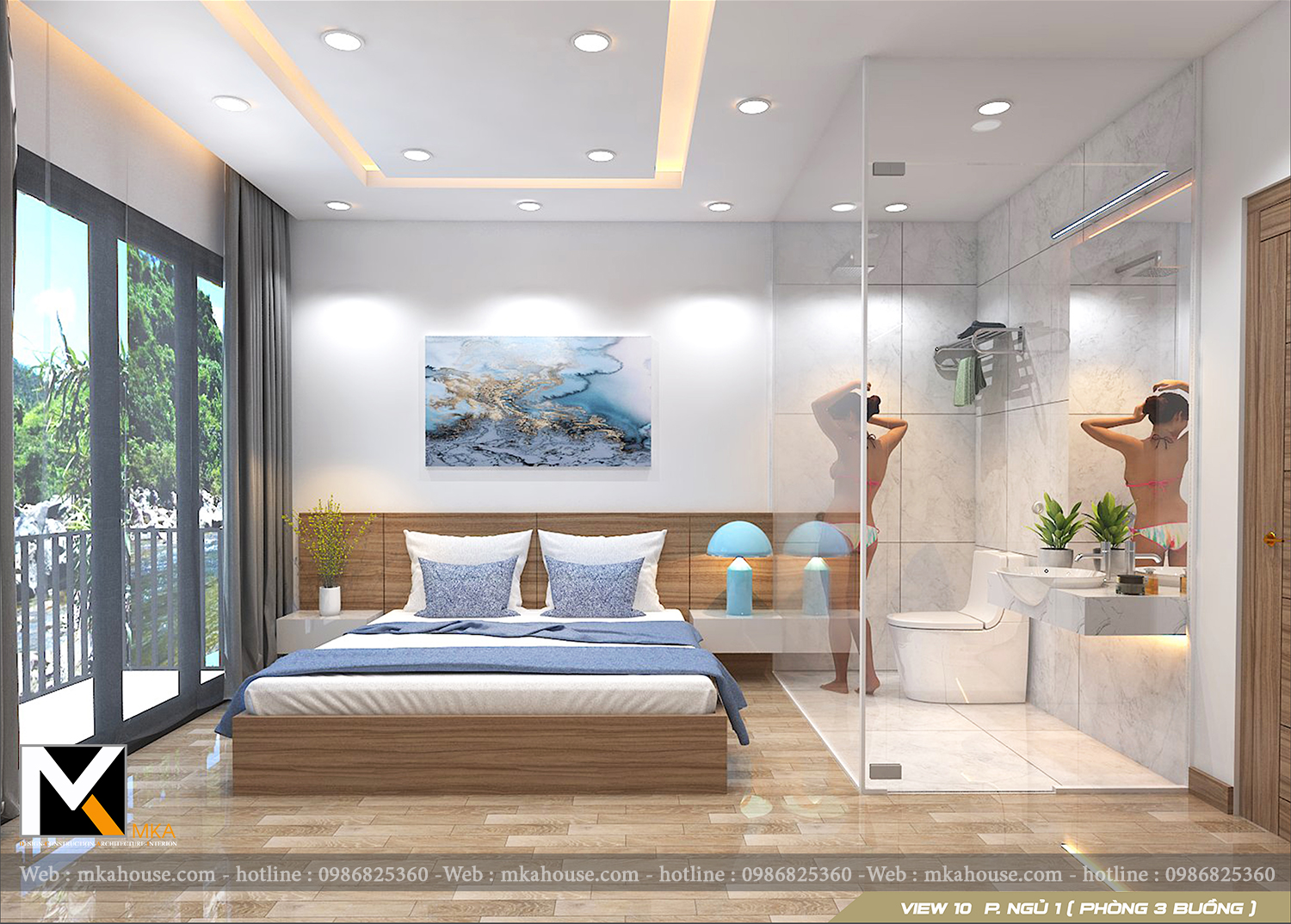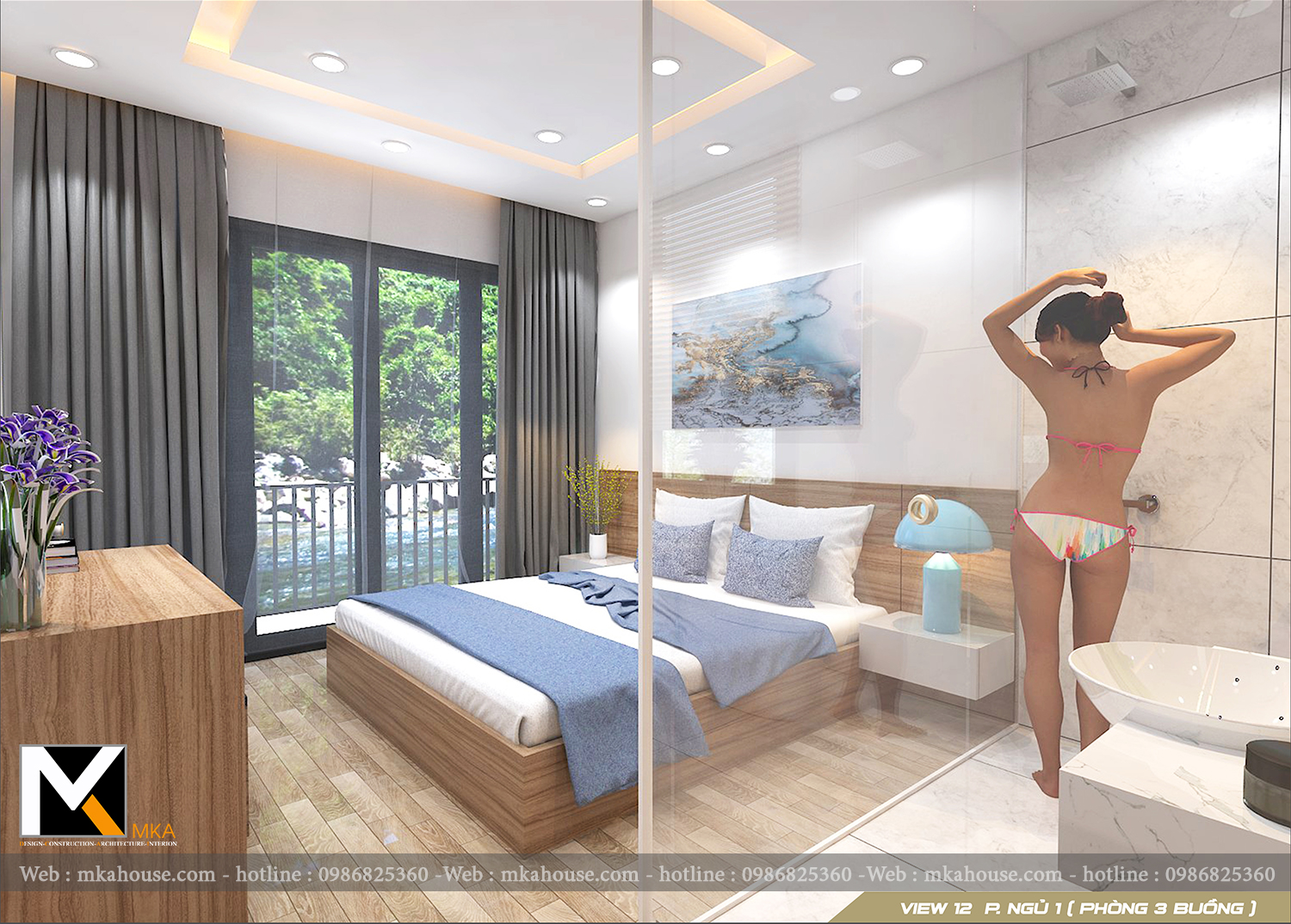 Phòng tắm có kính trong suốt và kết hợp với nhà vệ sinh tiện lợi